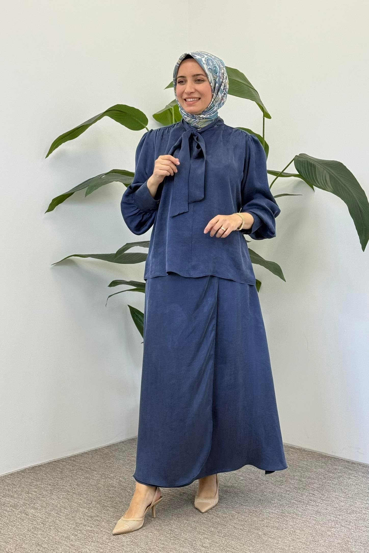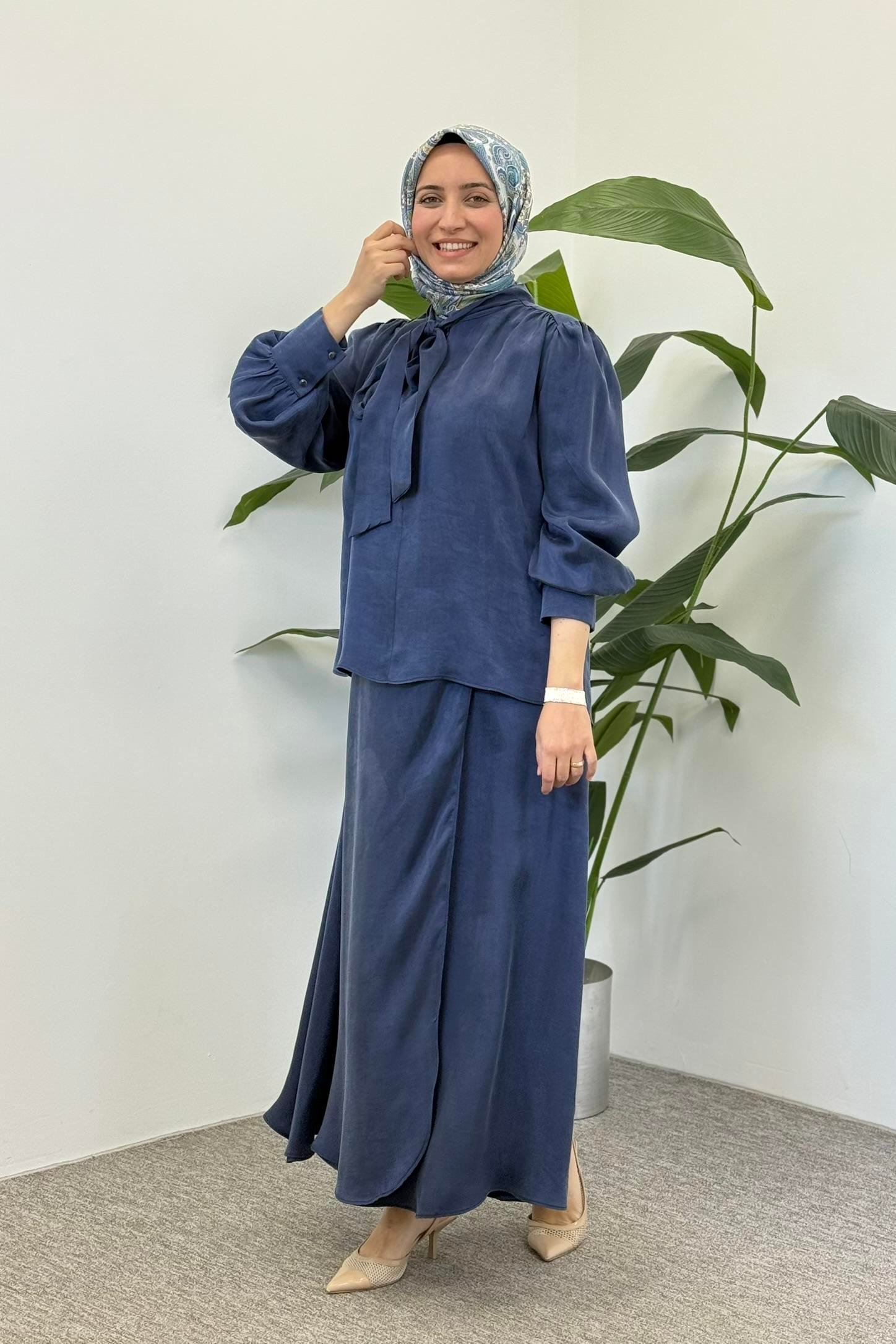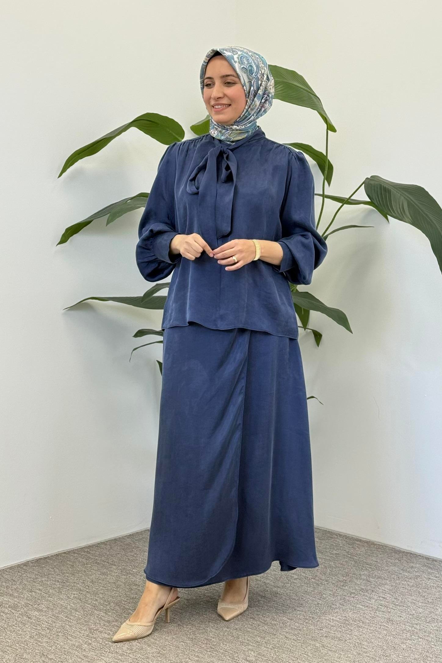NPrive F19482 Önü Bağlama Detay İpek Qupra Takım - Lacivert