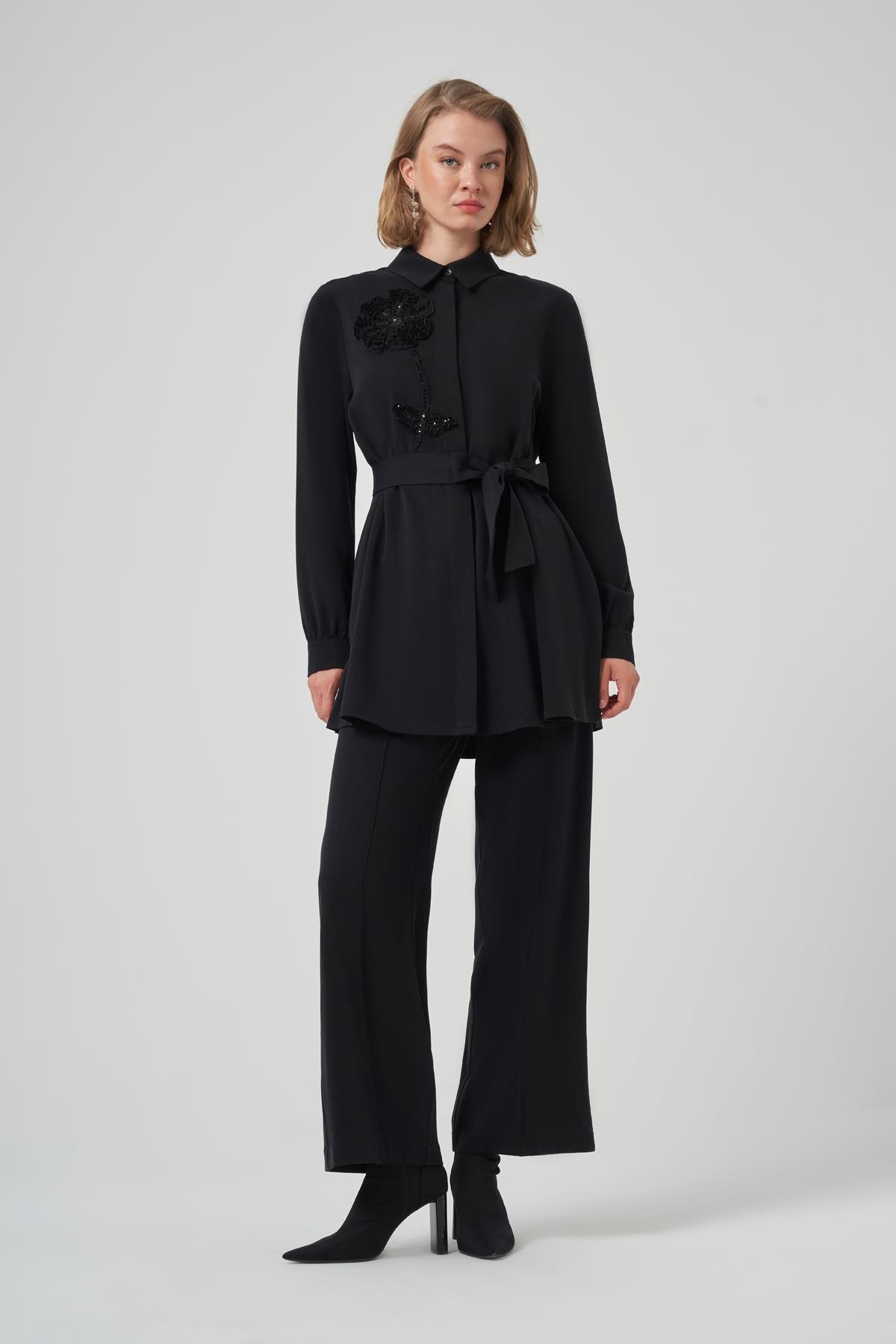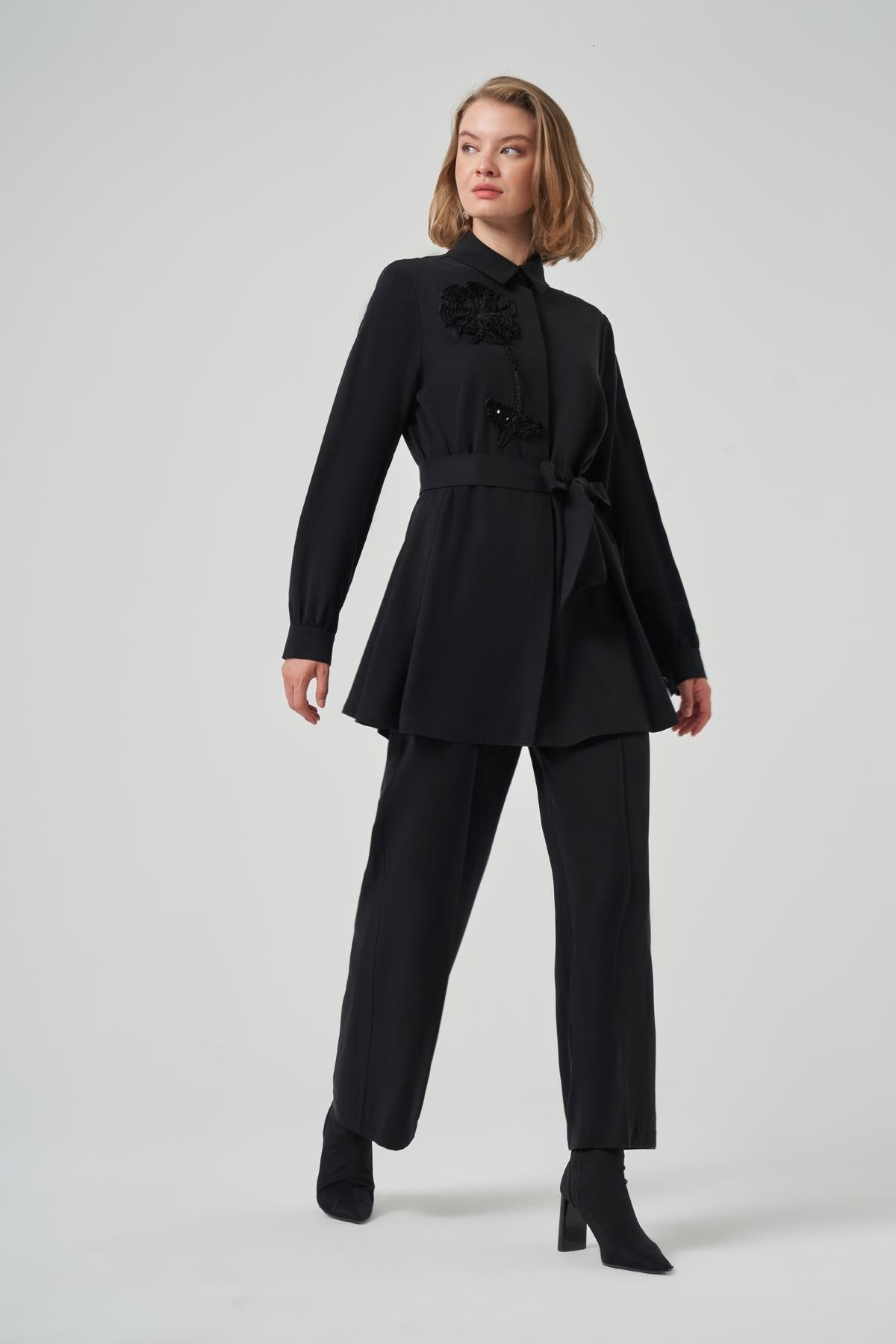 Nuss 1030 Gül Nakış İşlemeli Takım - Siyah