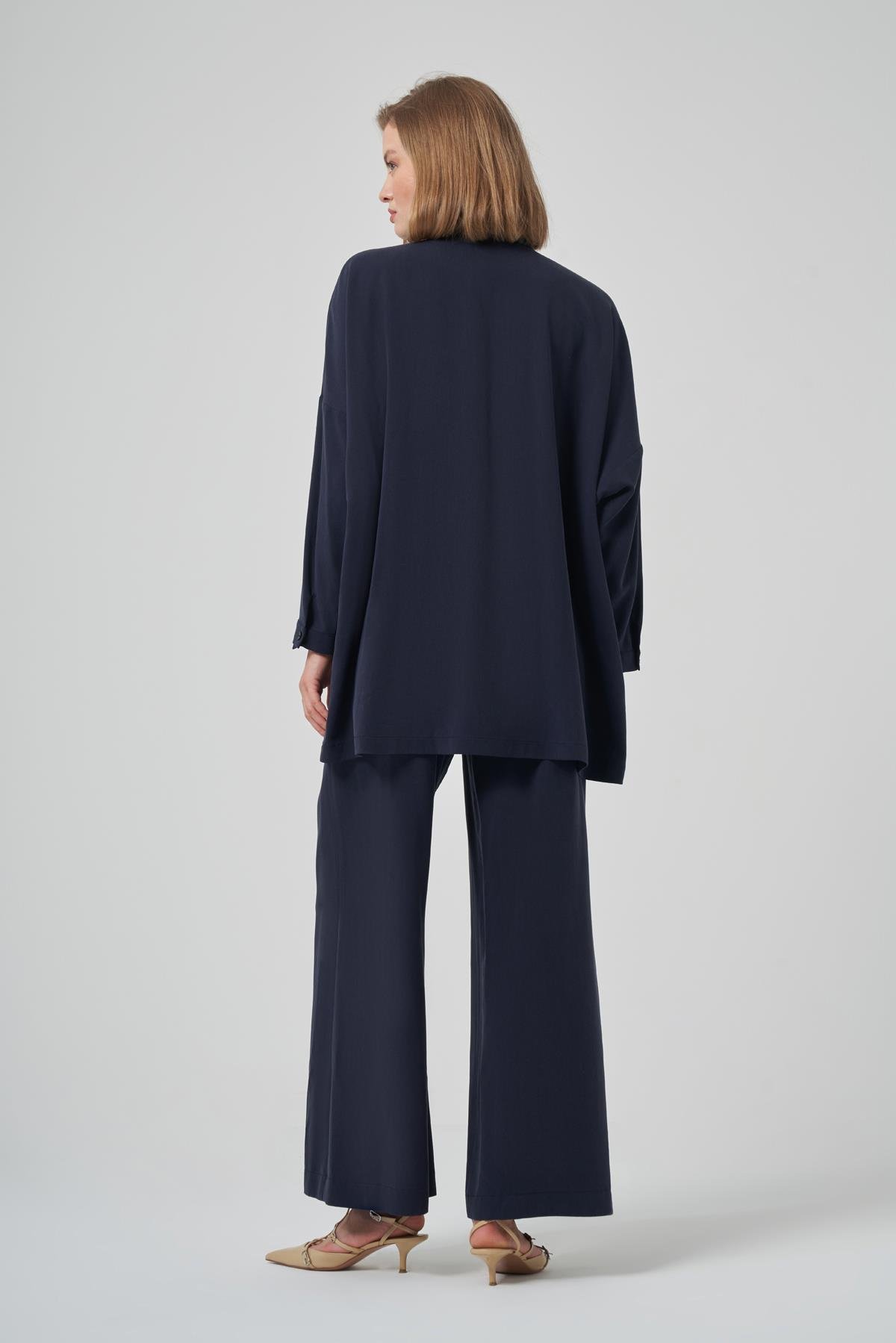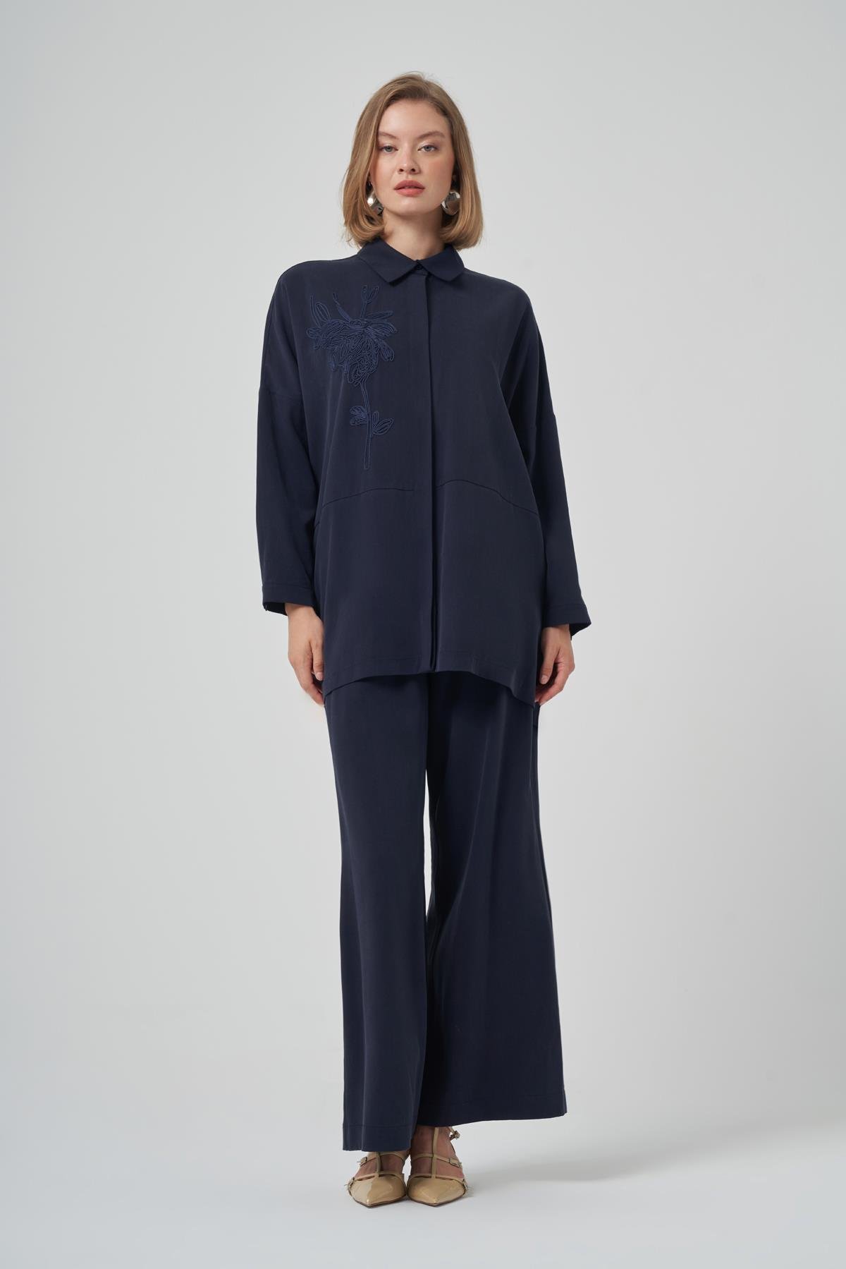 Nuss 1034 Yaka Nakış İşlemeli Pantolonlu Takım - Lacivert