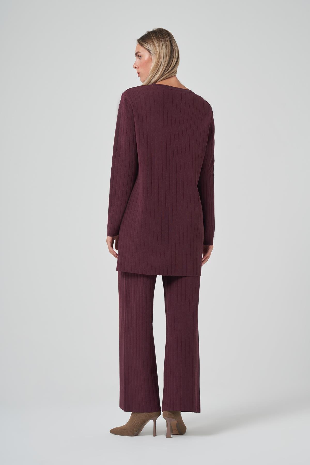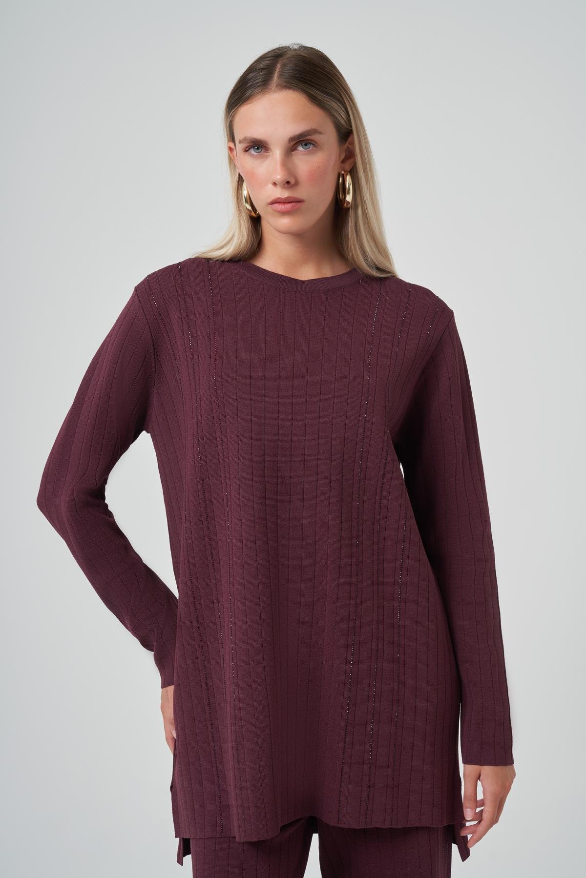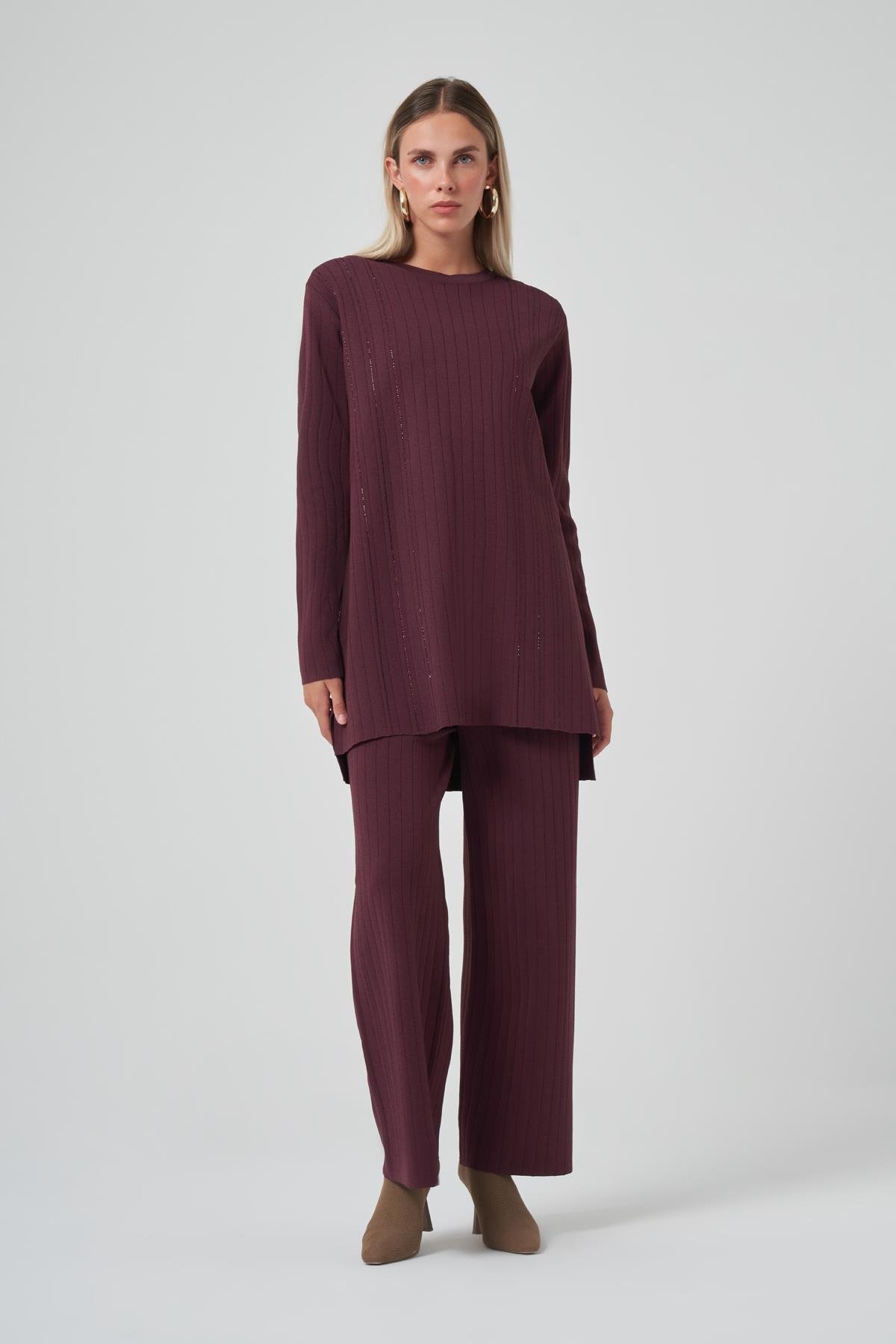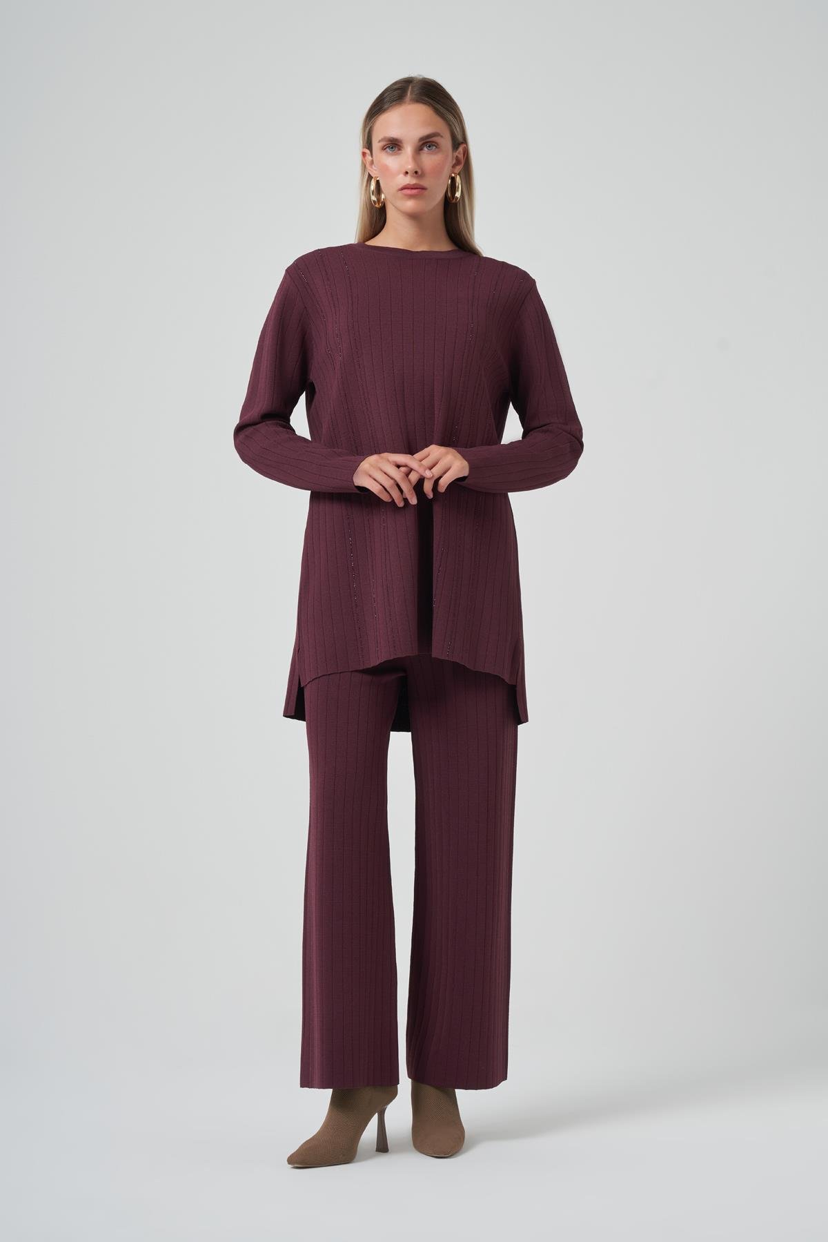 Nuss 1355 Şerit Taş Detay Pantolonlu Triko Takım - Bordo (350267919)