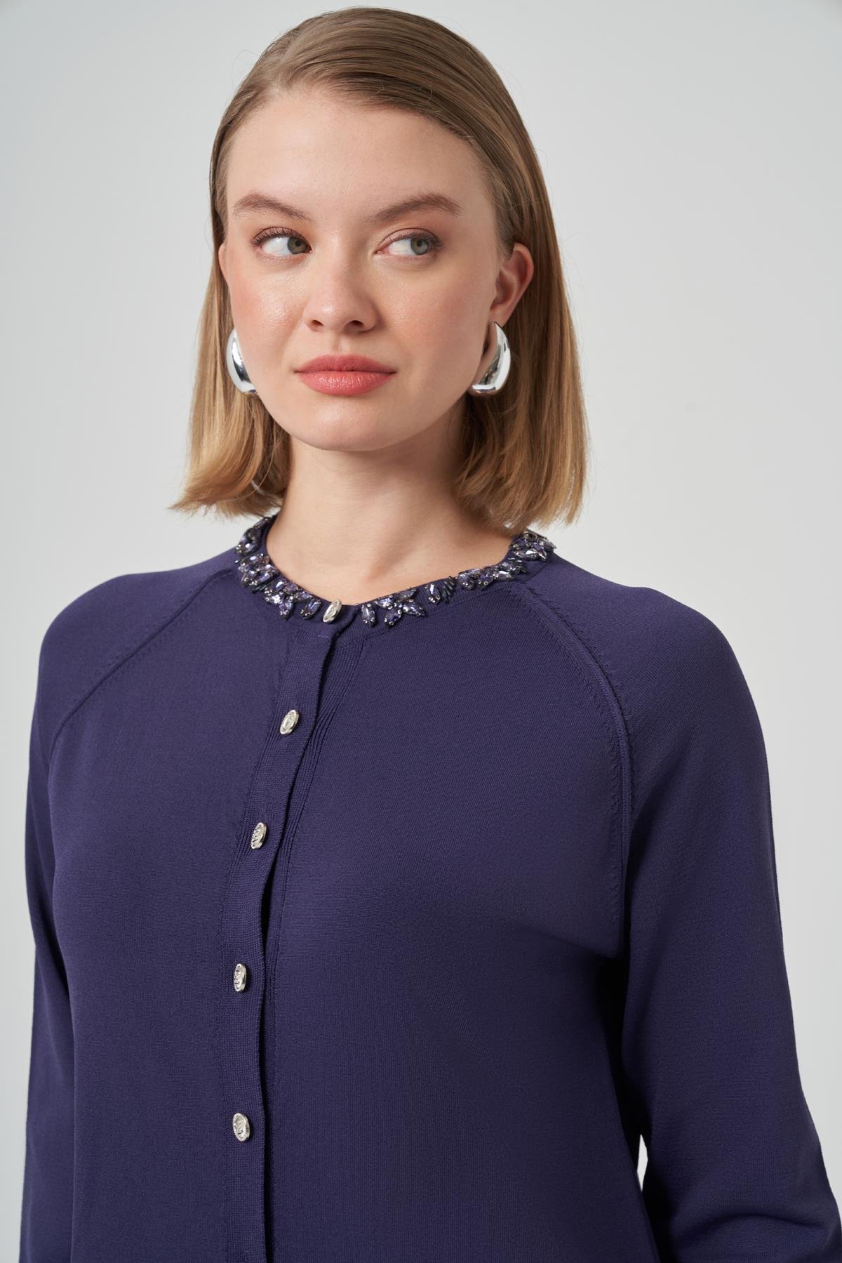 Nuss 300T Yaka Taş Detay Düğmeli Hırka - Lacivert (357267900)