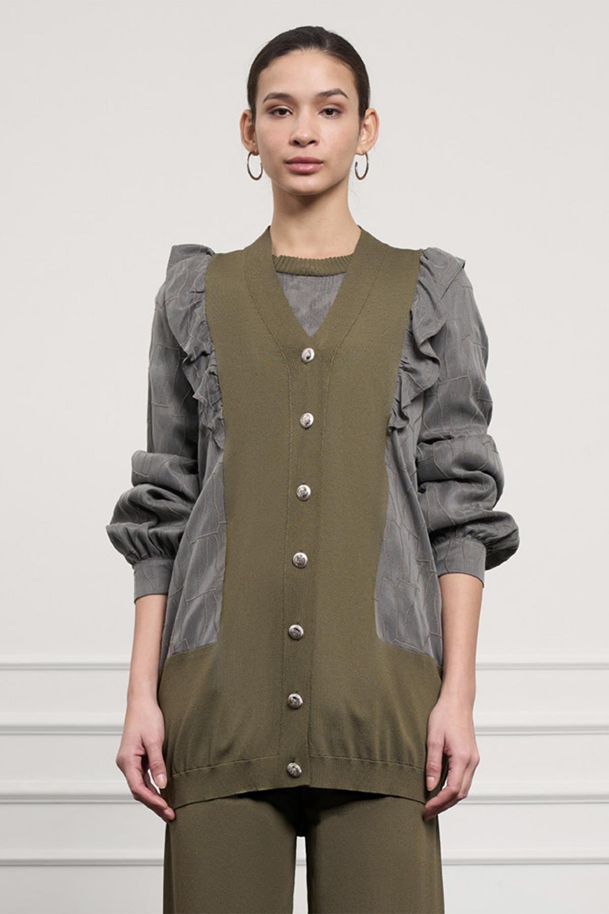 Nuss 6051 Kolları Nakış İşlemeli Düğmeli Merserize Hırka - Haki