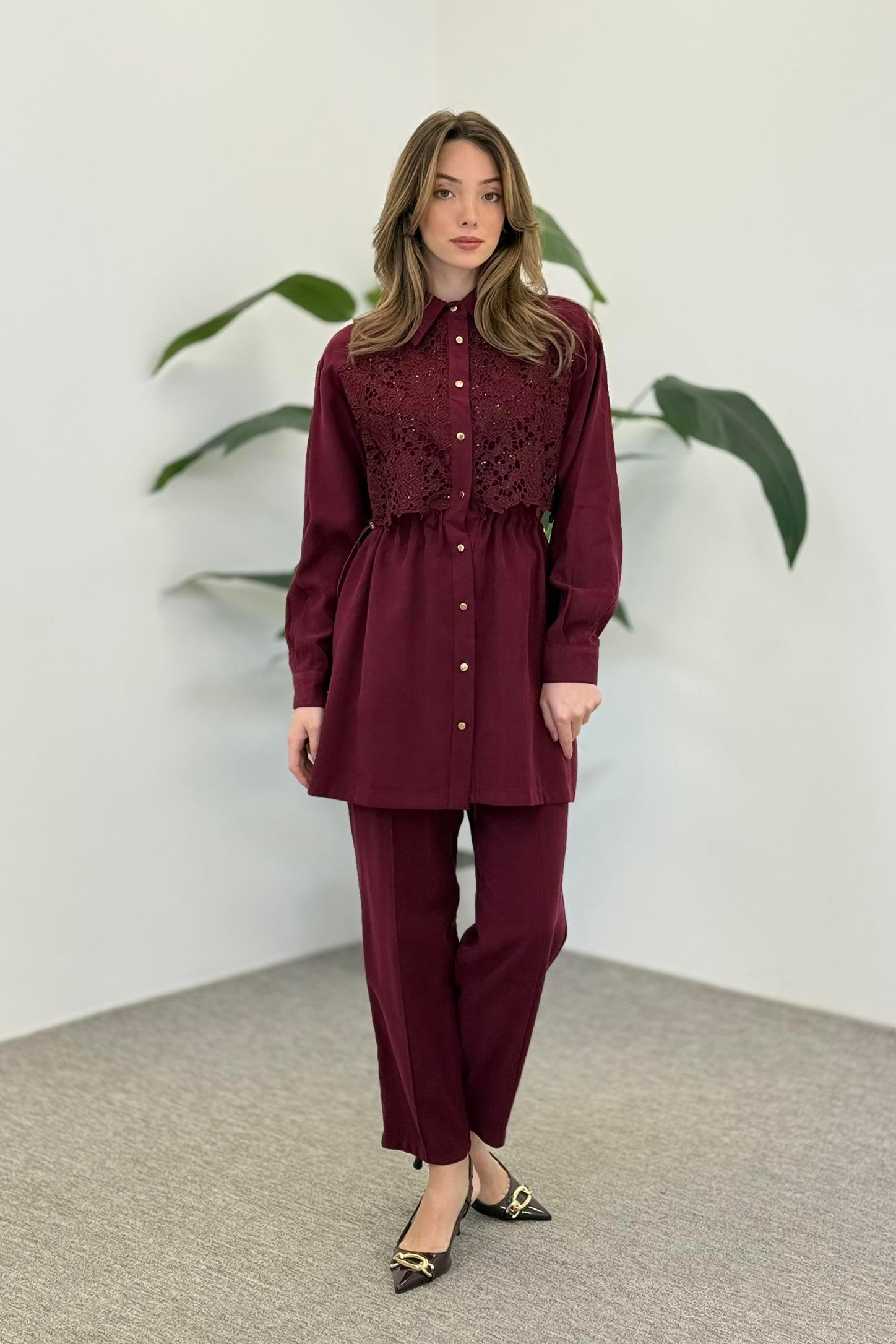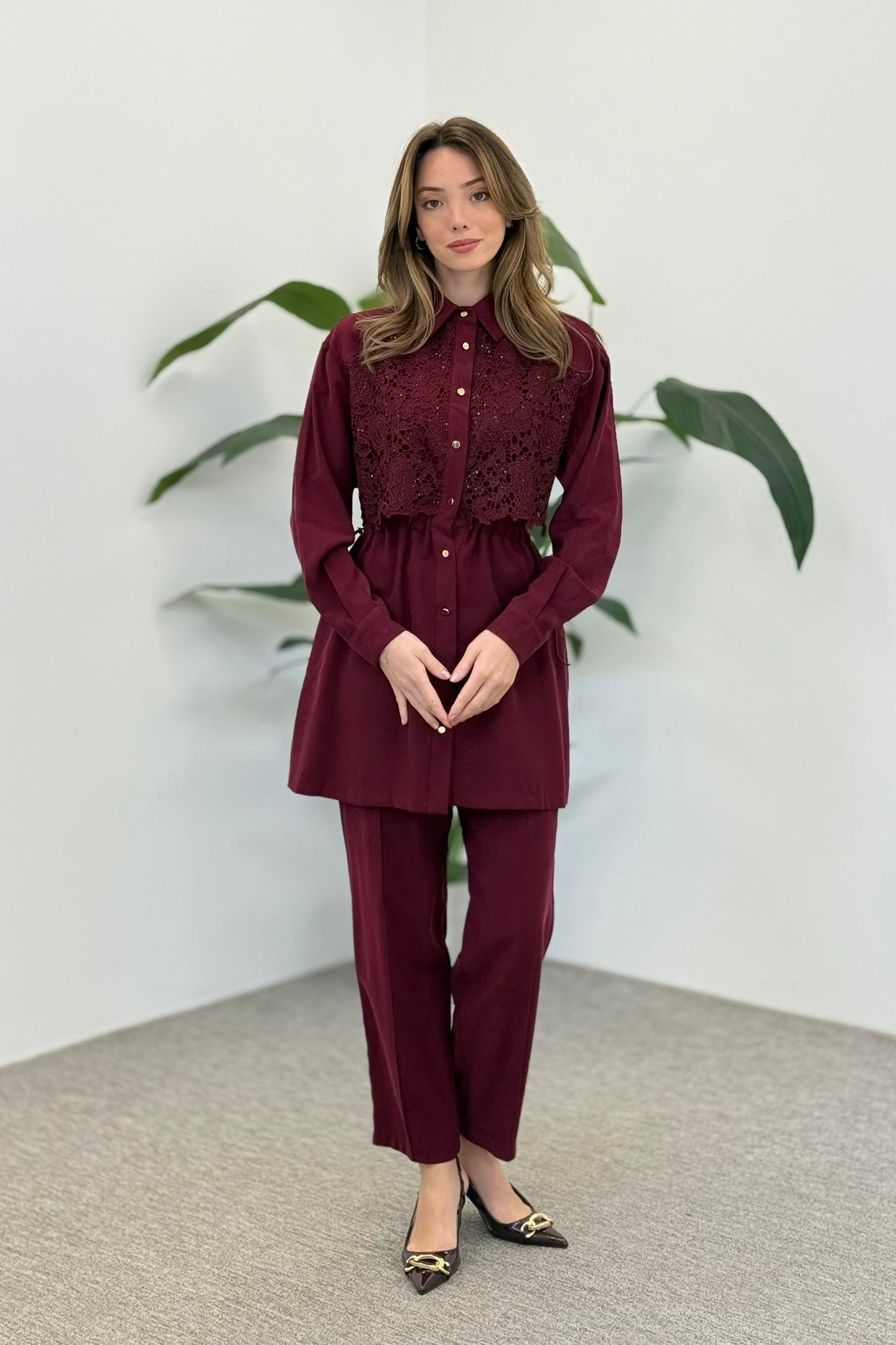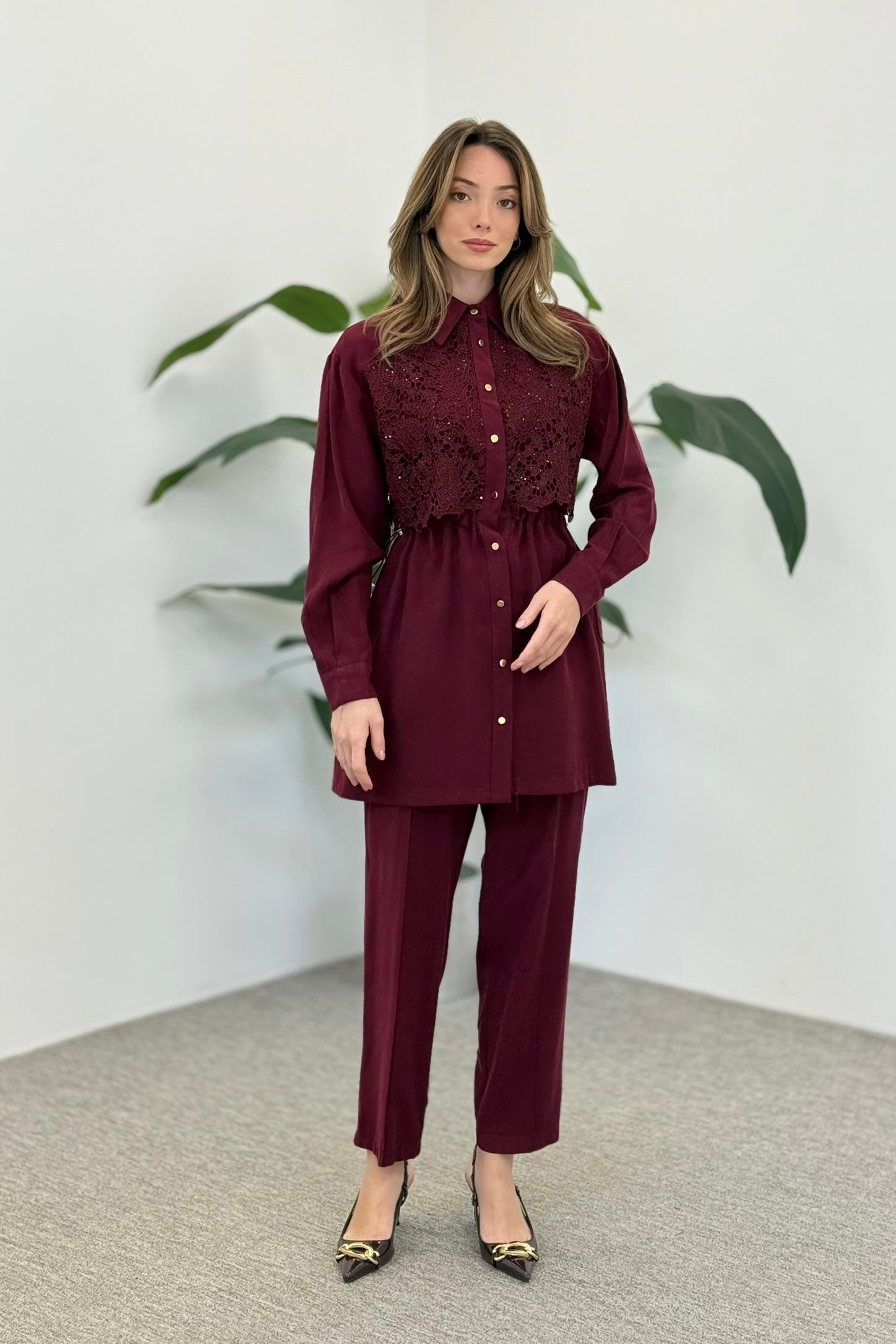 Payet ve Dantel İşlemeli Pantolonlu Takım 1394 - Bordo (350307915)