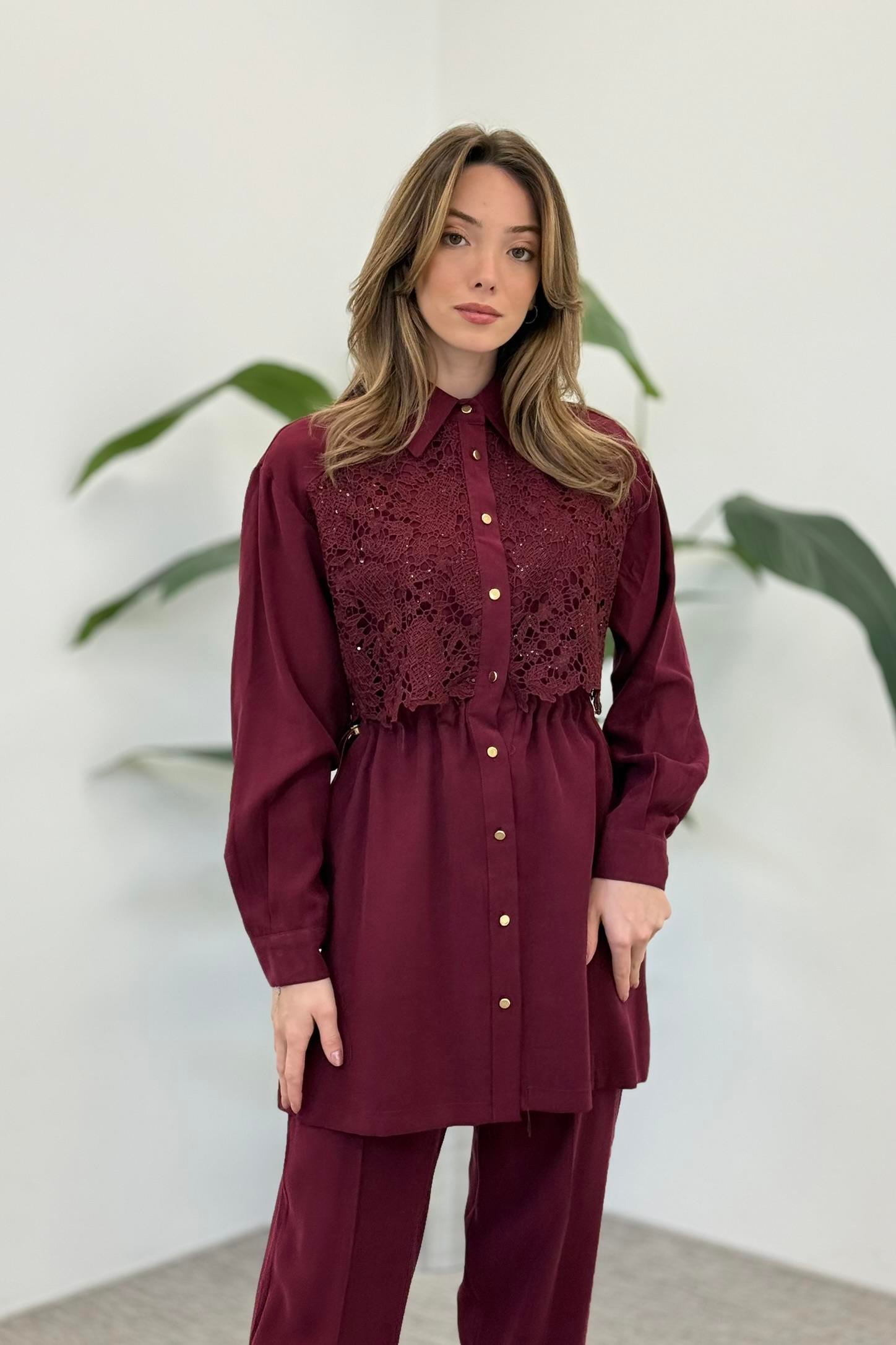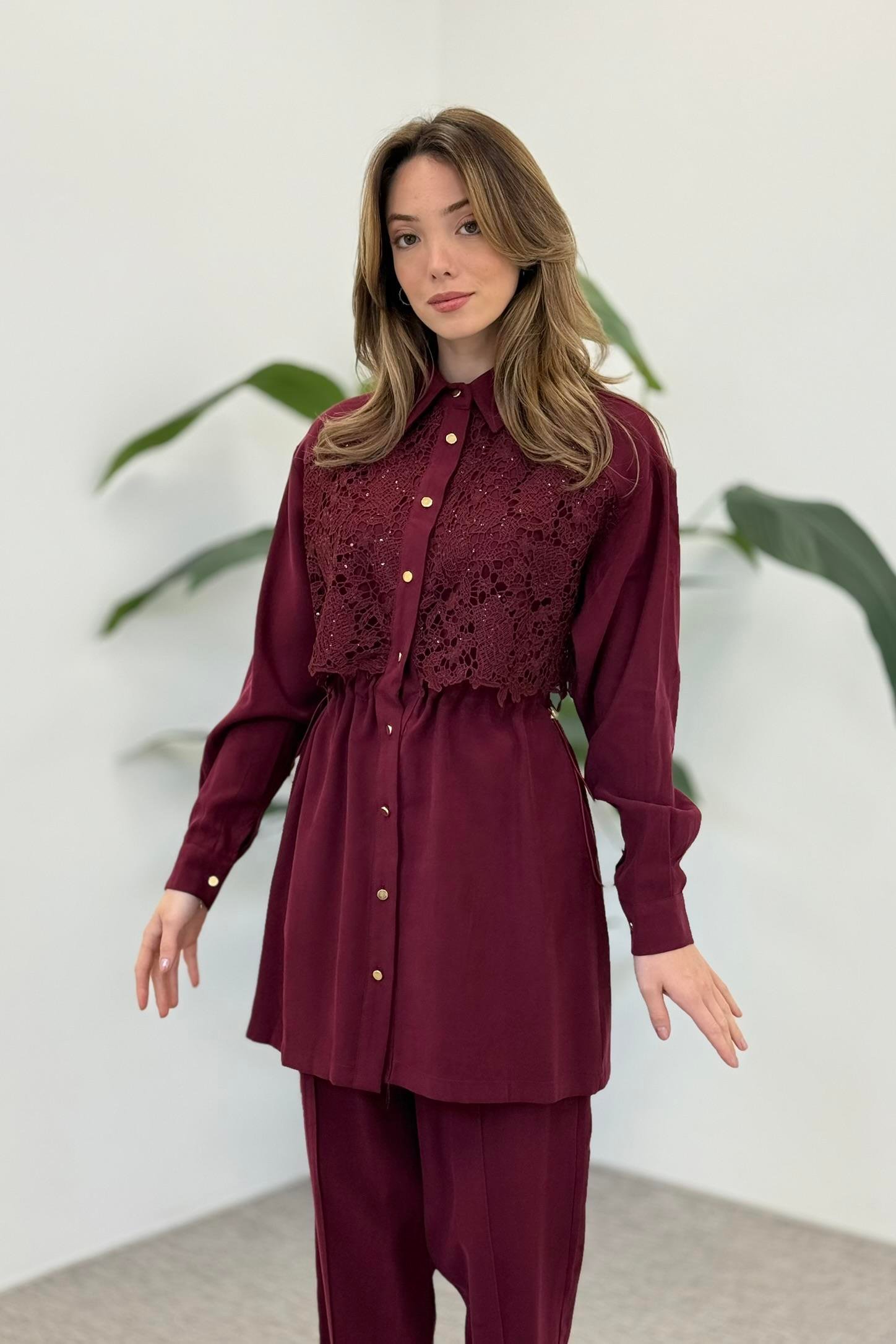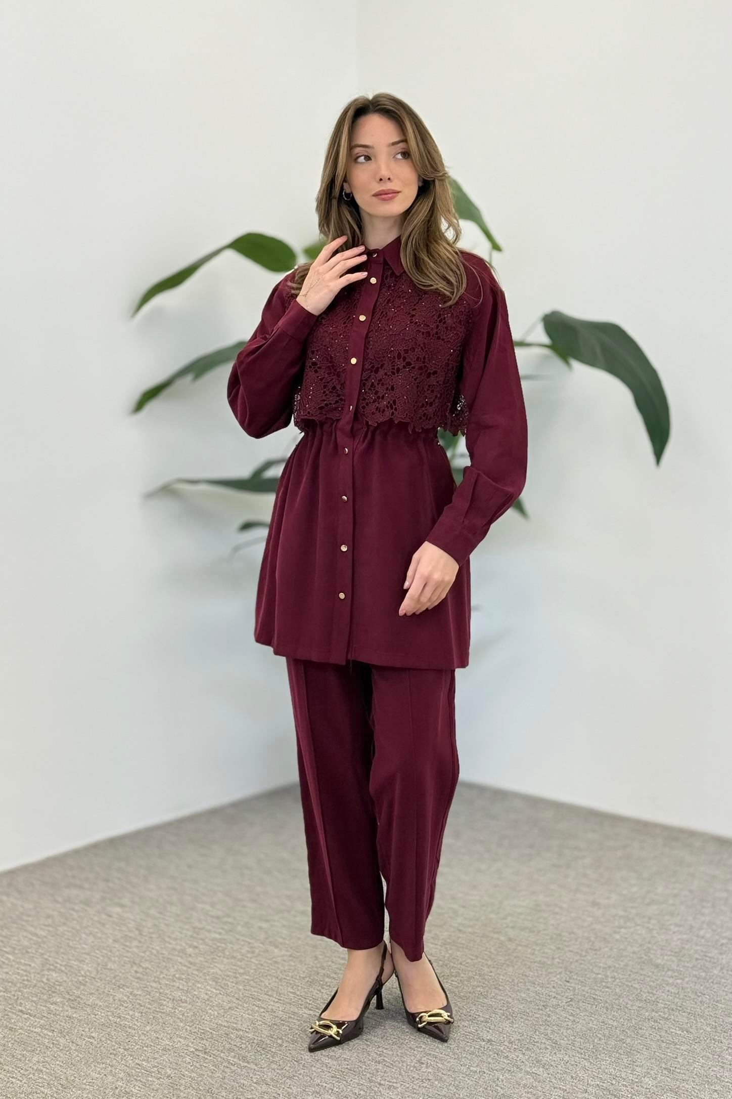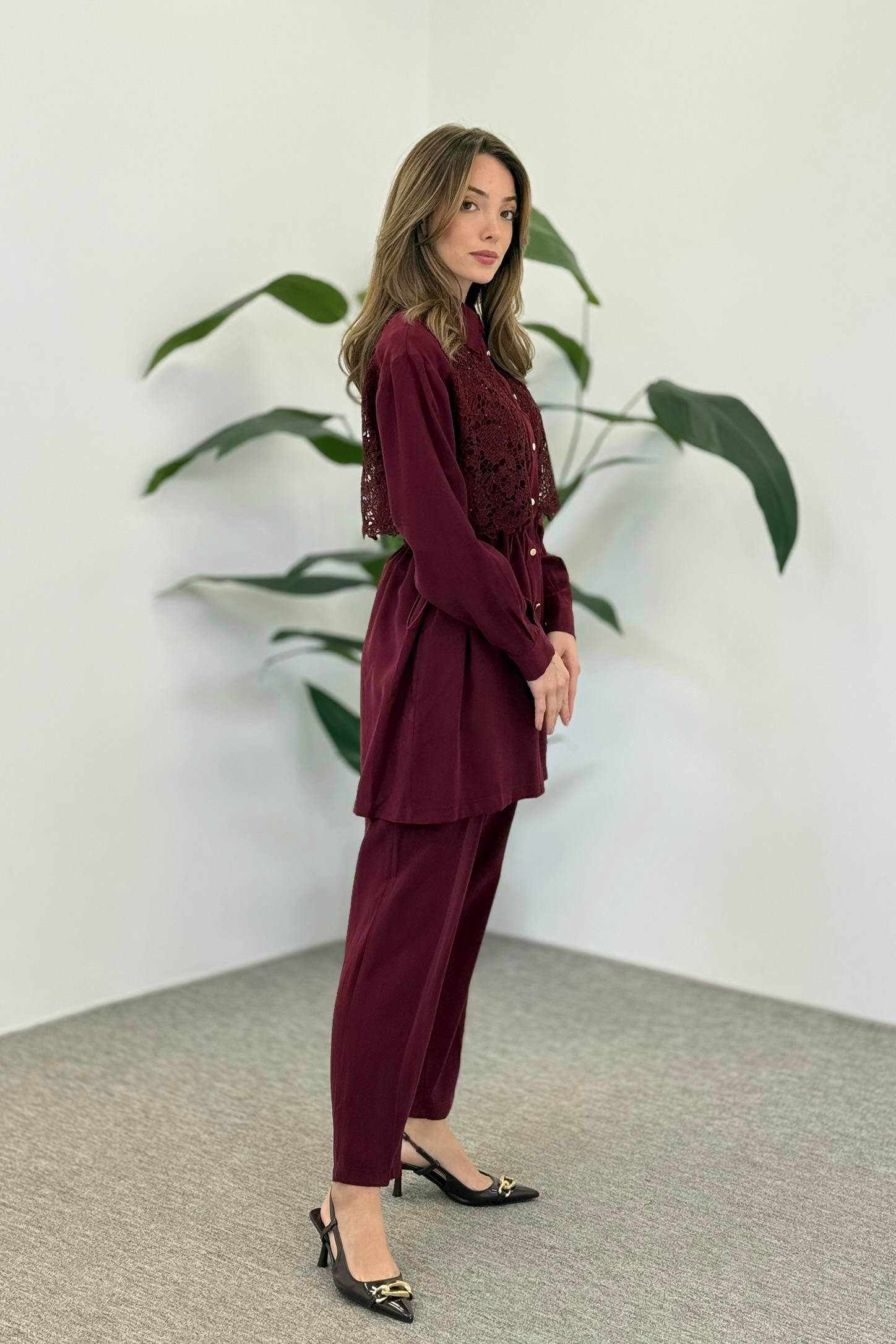 Payet ve Dantel İşlemeli Pantolonlu Takım 1394 - Bordo (350307915)