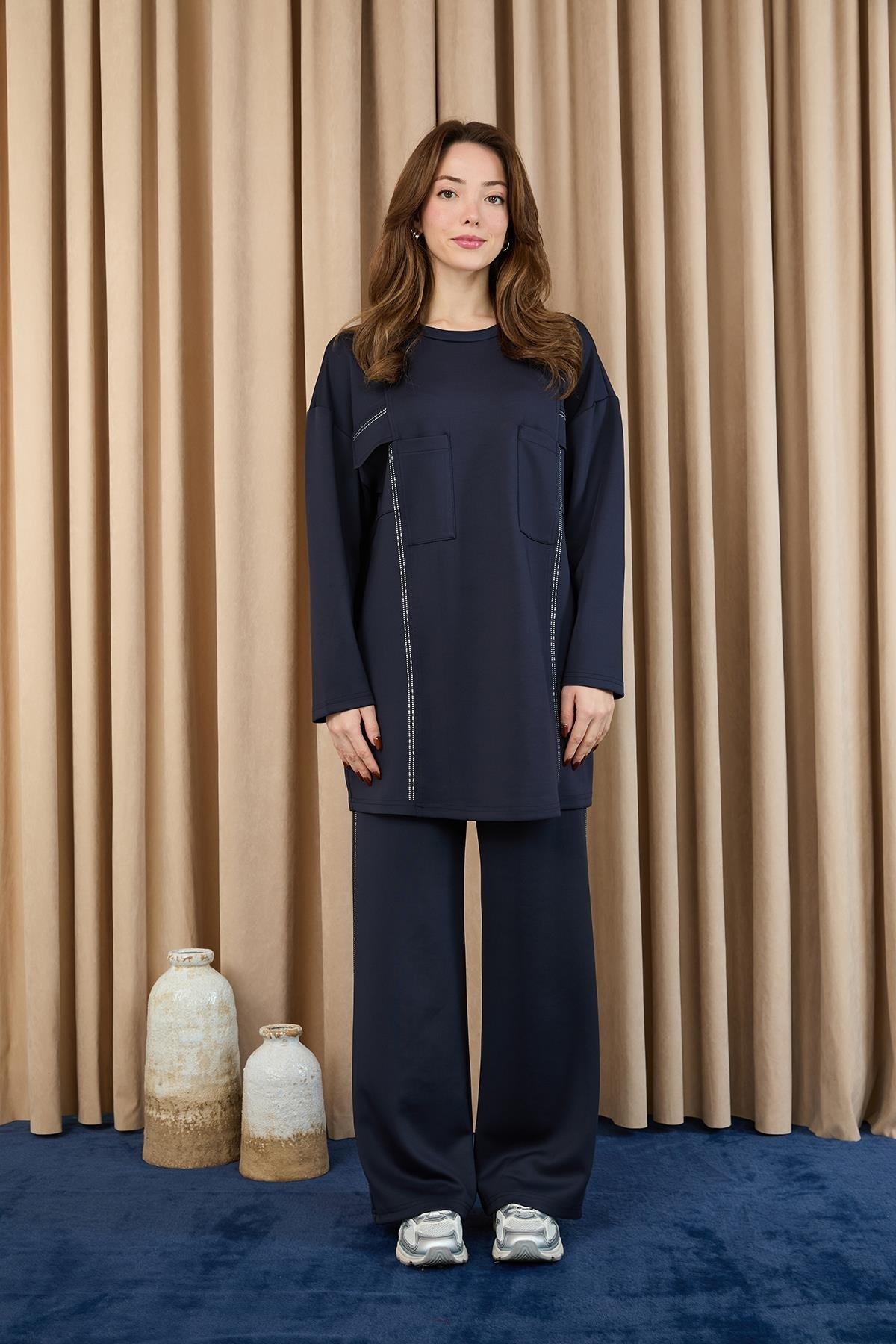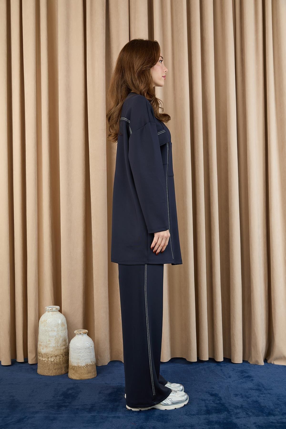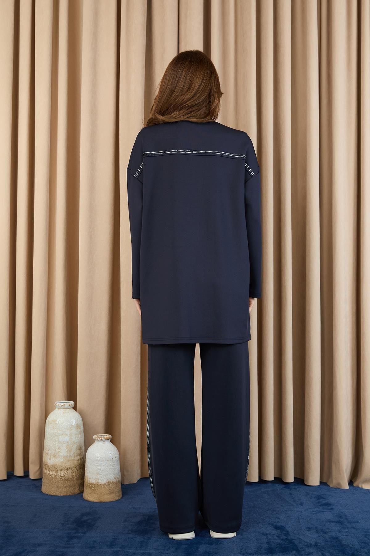 Taş Şerit Aksesuarlı Pantolonlu Takım 14379 - F.Navy (350251913)