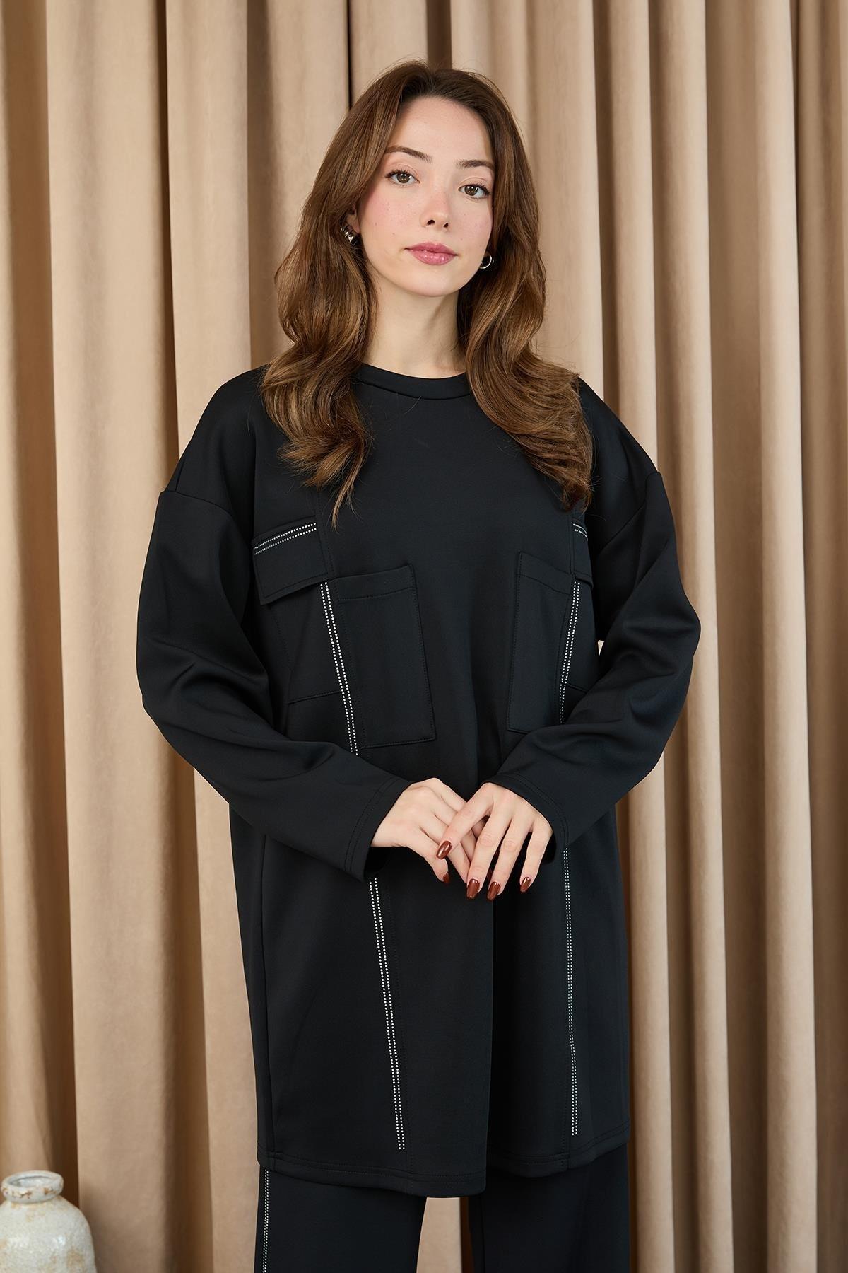 Taş Şerit Aksesuarlı Pantolonlu Takım 14379 - Siyah (350251913)