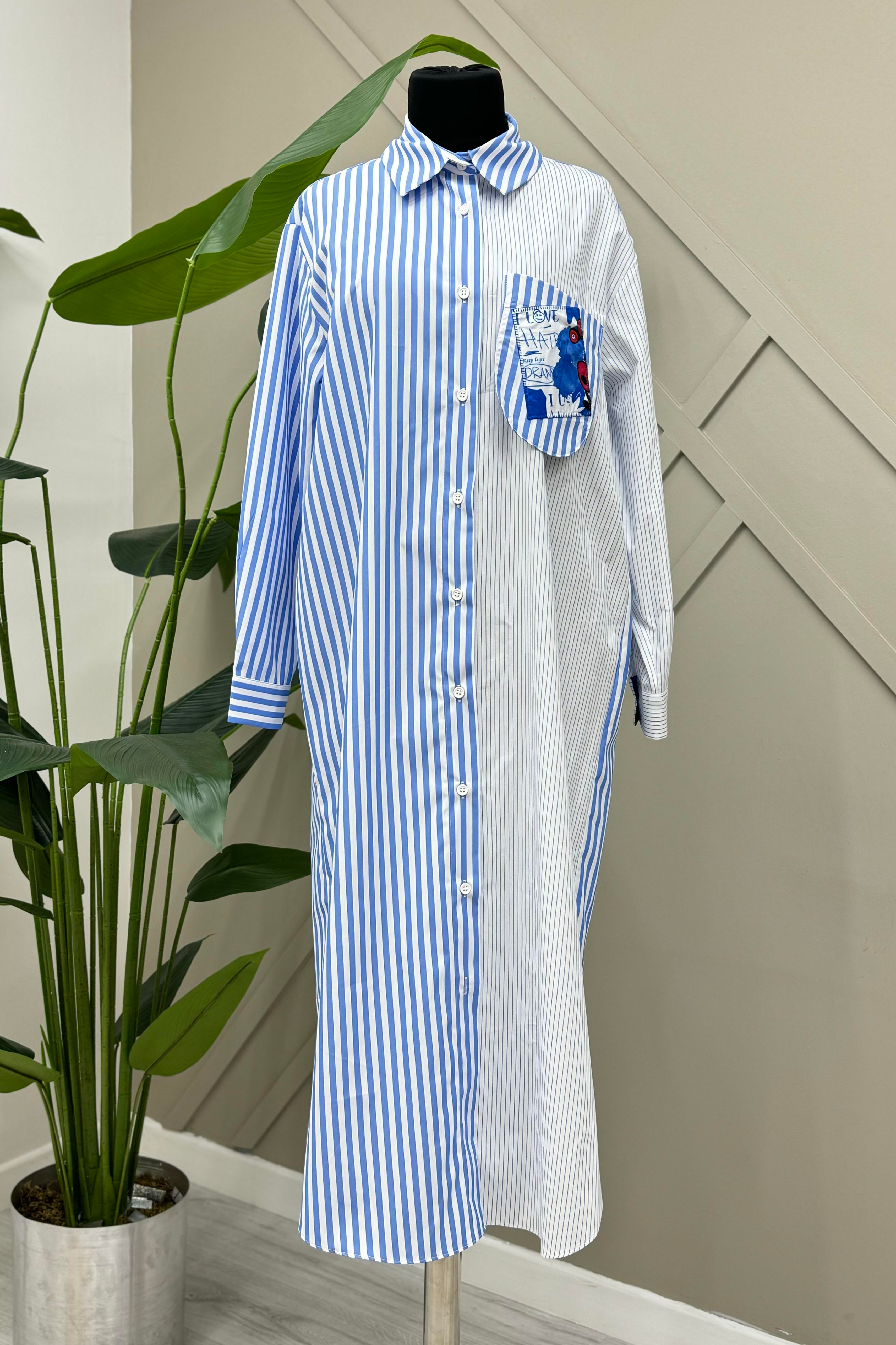 Torba Cep Detaylı Uzun Çizgili Gömlek Tunik 10487 - Mavi (362251659)