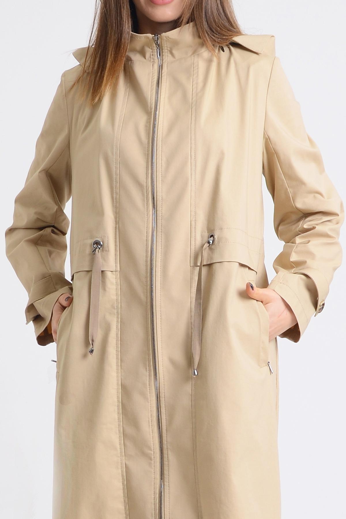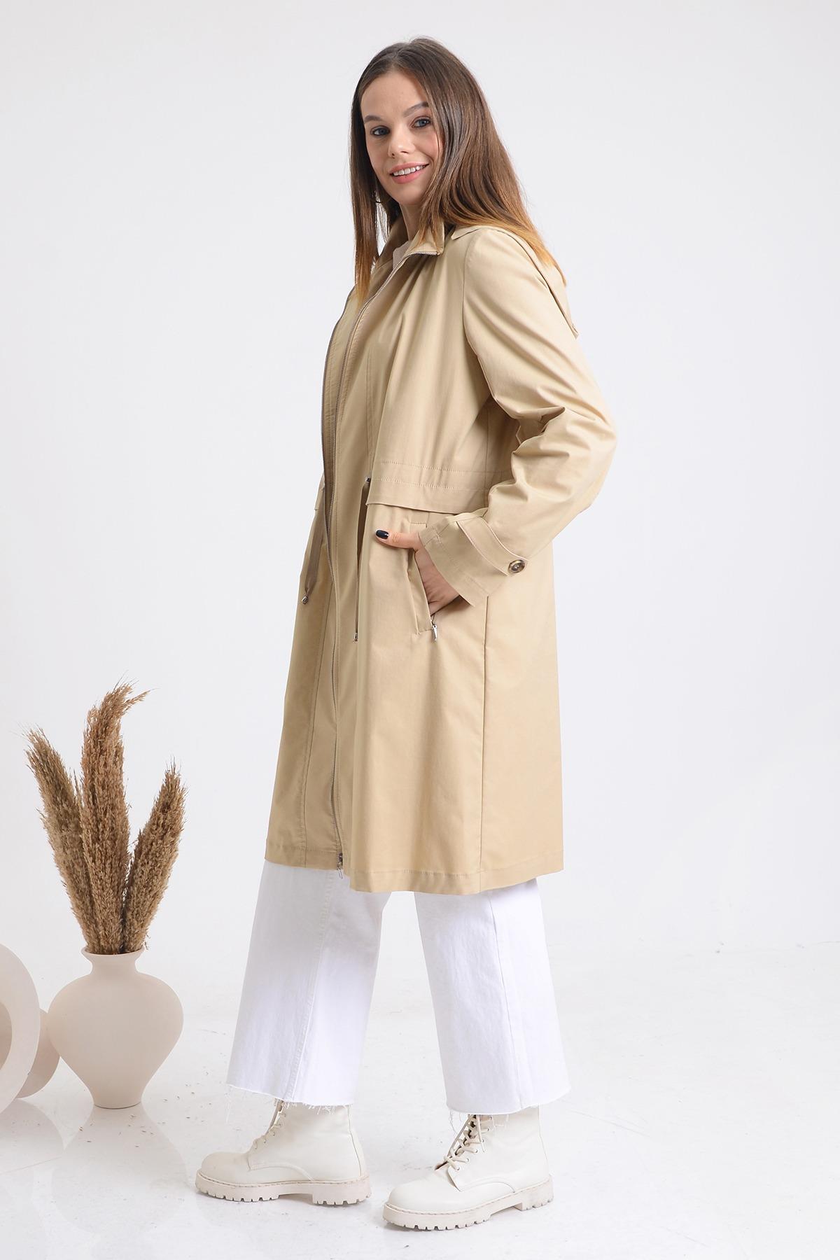 Trenç 3534 Bel Büzgü Detay Fermuarlı Trençkot - Camel