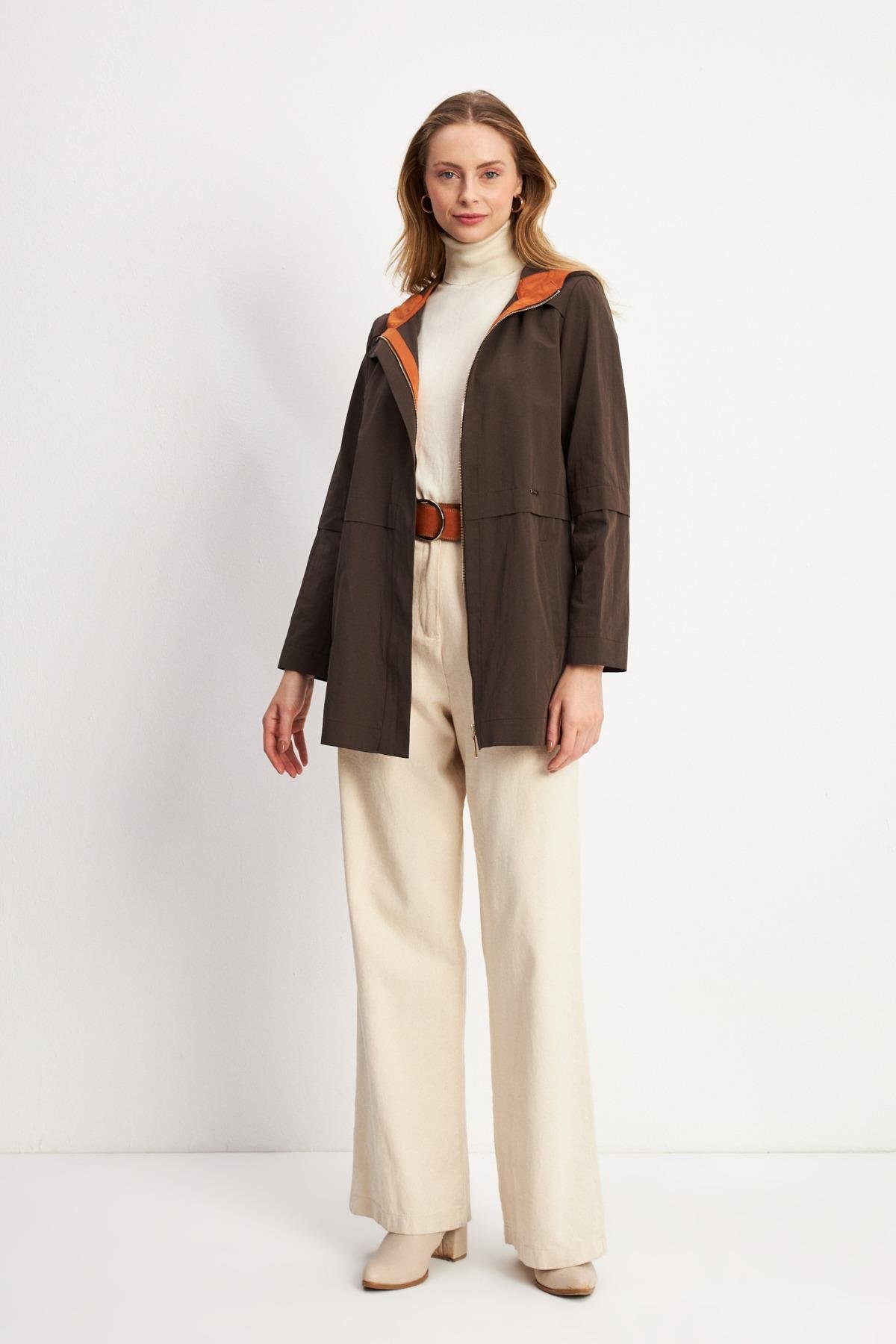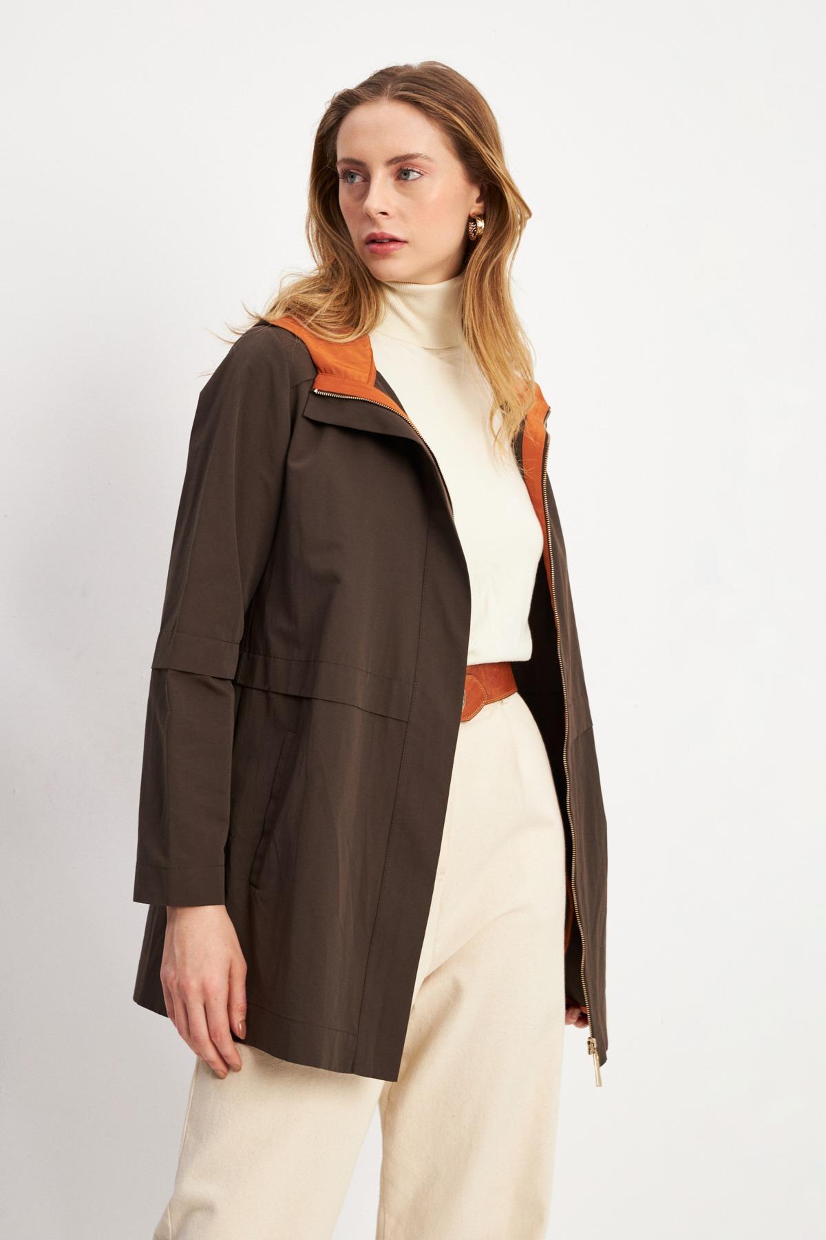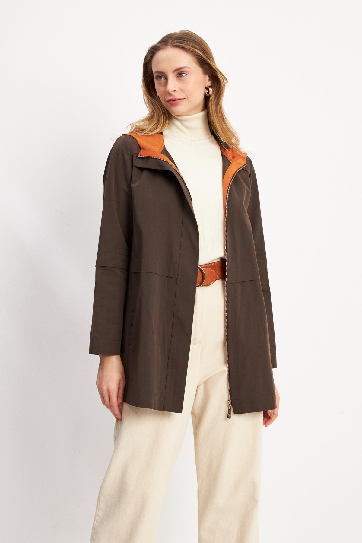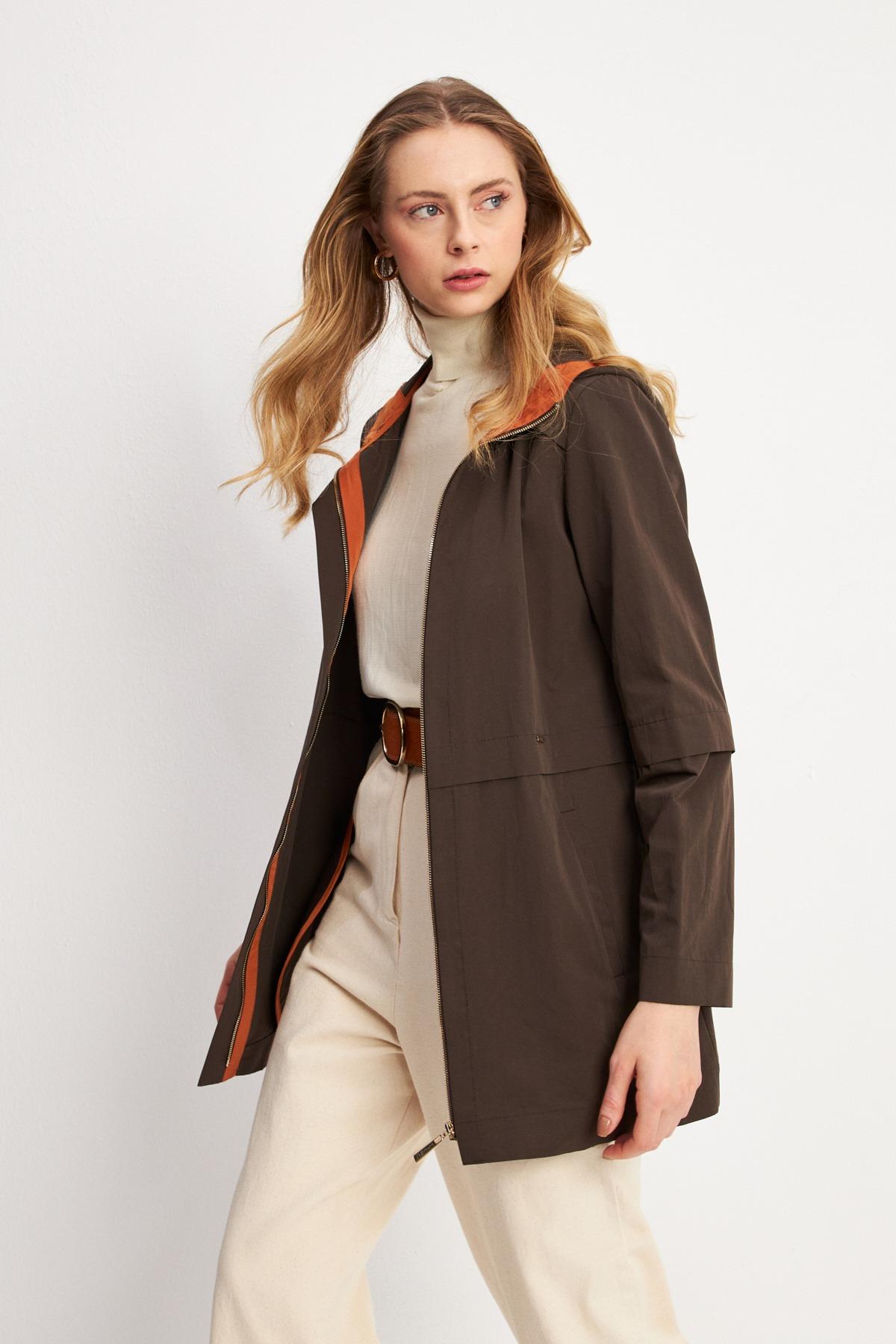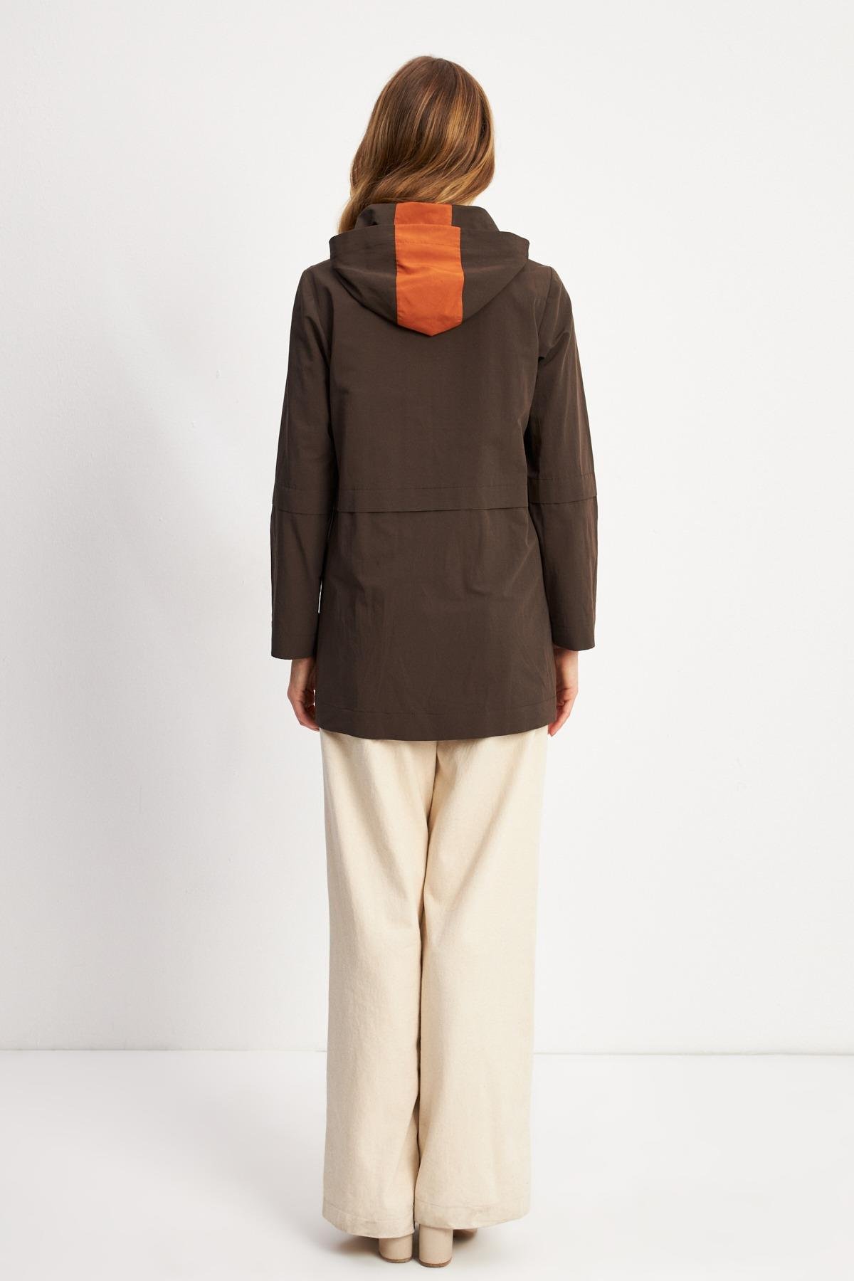 Trenç 3664 Kapüşonu Renk Detaylı Trençkot - Kahve