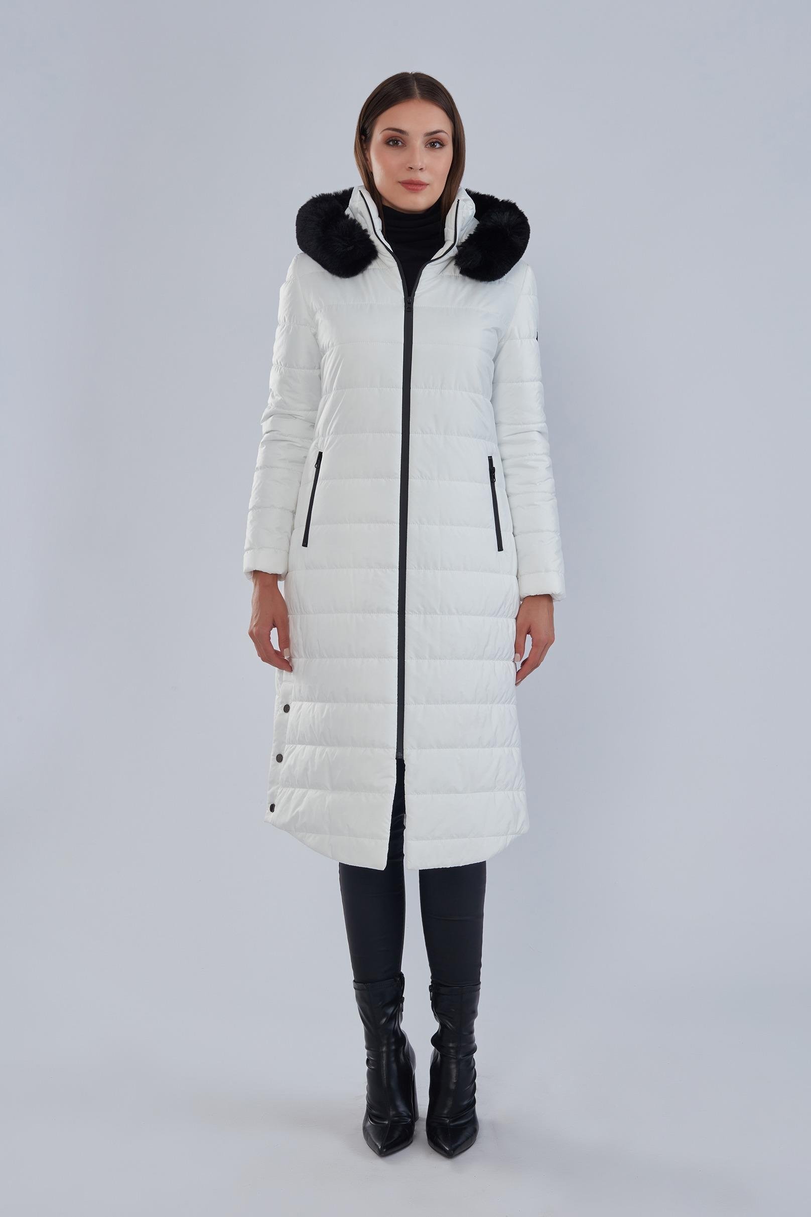 Trenç 5601 Yan Çıtçıt Detay Kapişonu Kürklü Mont - Beyaz