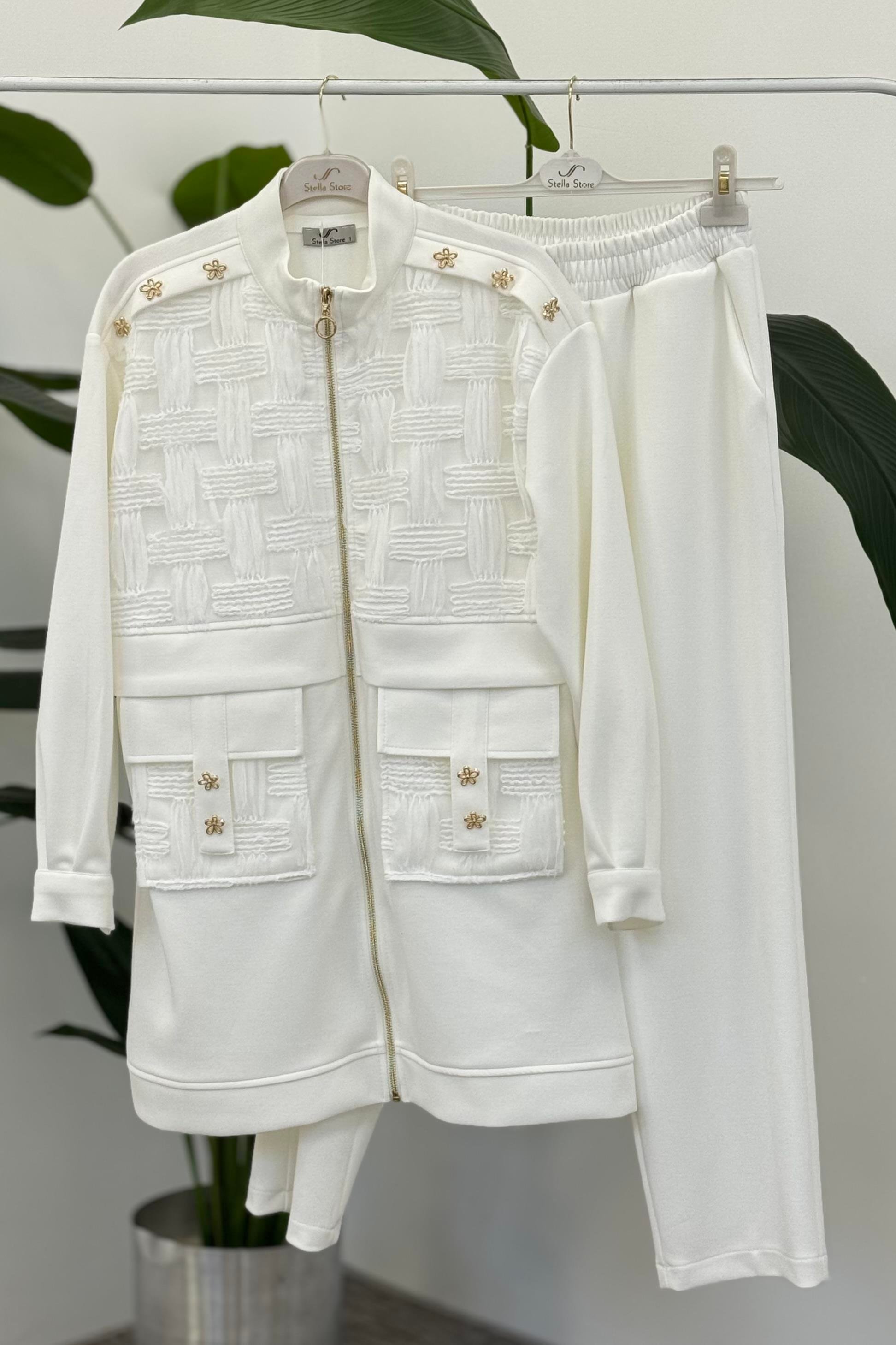 Tülü Kabartma Detay Pantolonlu Takım 1385 - Ekru (350307907)