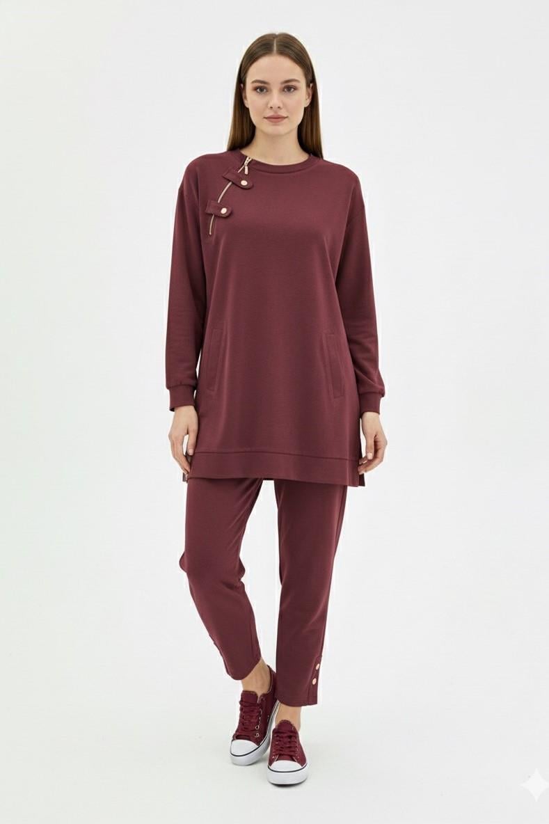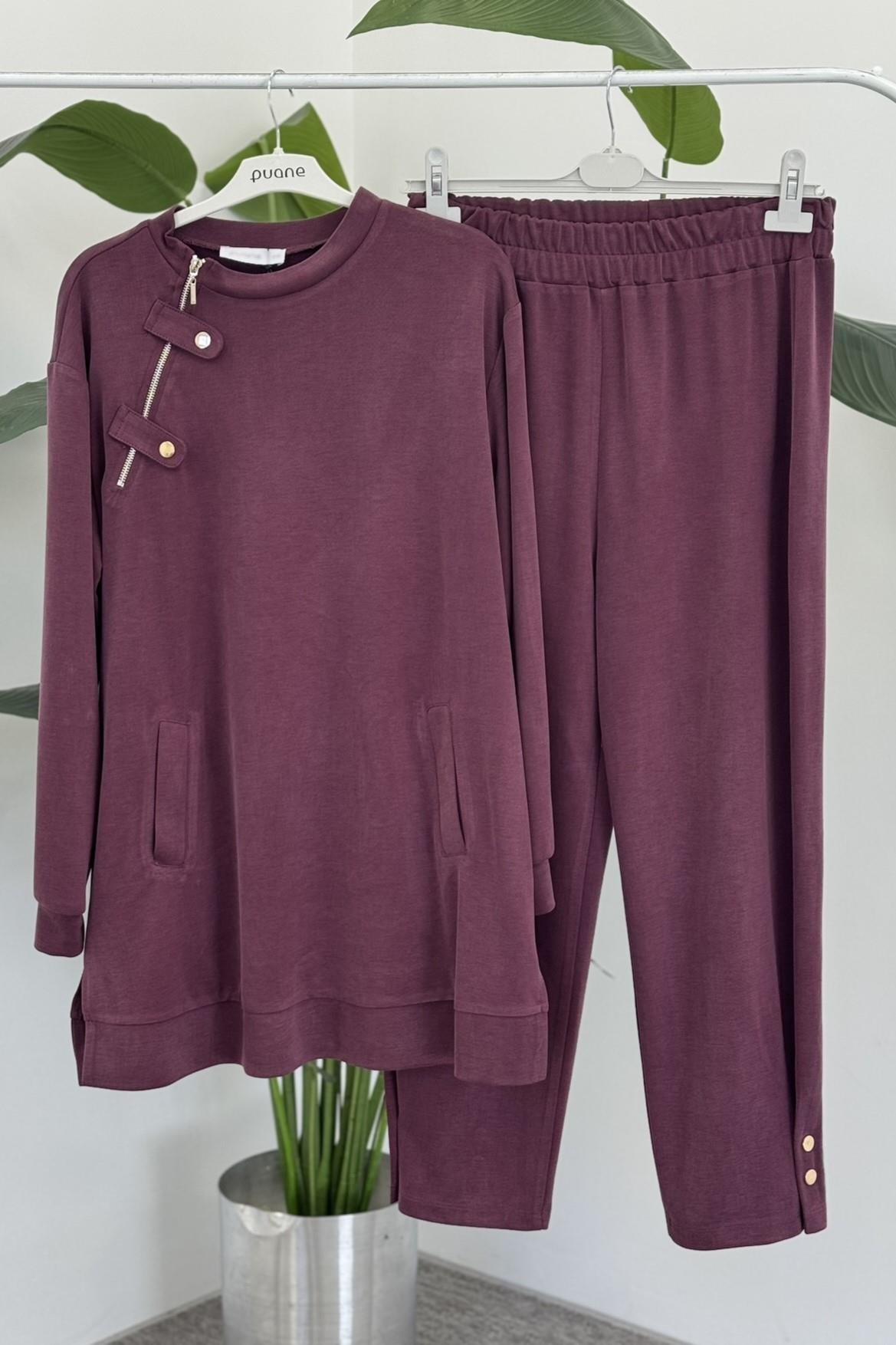 Yaka Fermuar Detay Pantolonlu Takım 14406 - Mürdüm (350251912)