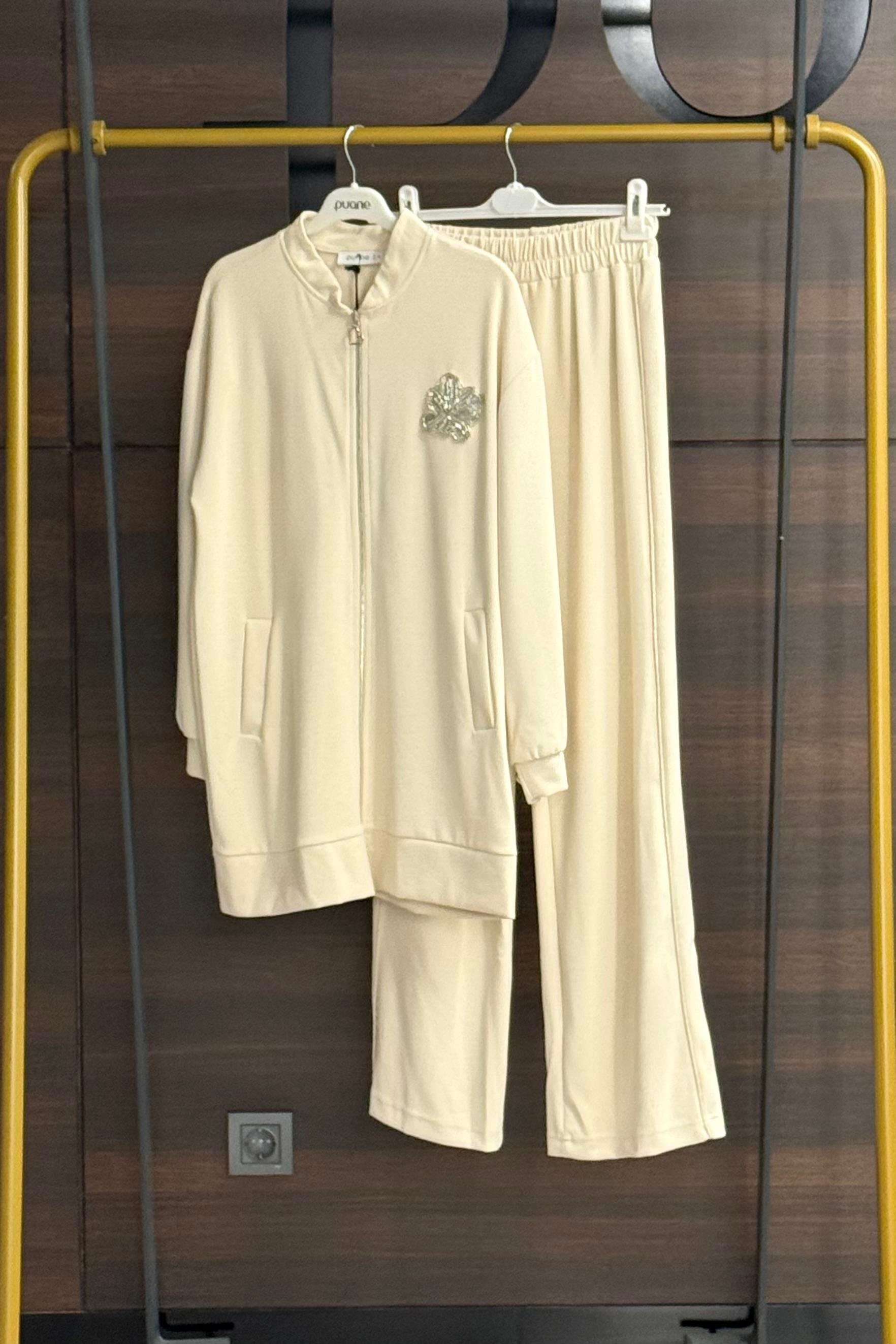 Yakası Boncuk Detaylı Pantolonlu Takım 14305 - Ekru