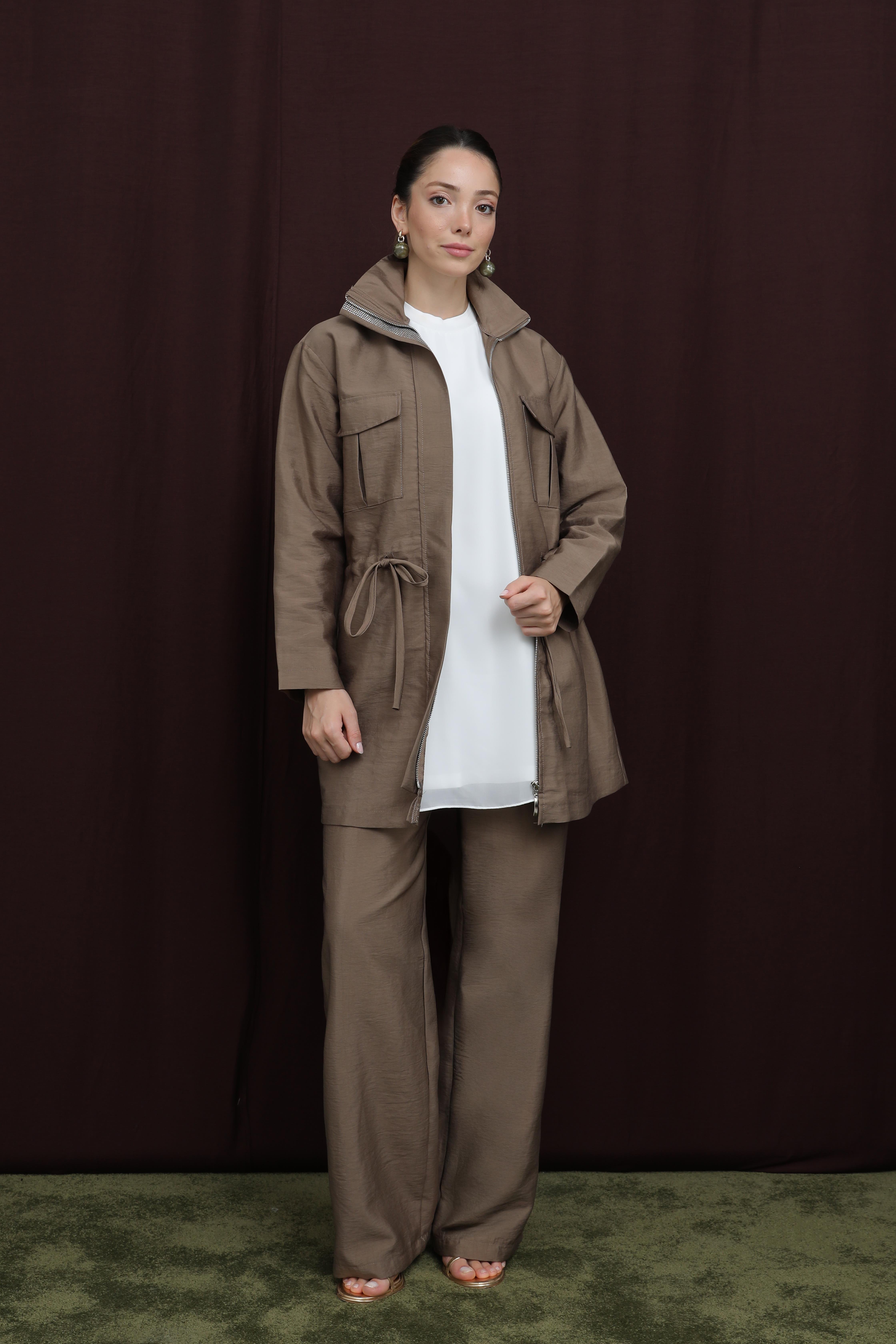 Yakası Taş Baskılı Pantolonlu Takım 14381 - Vizon