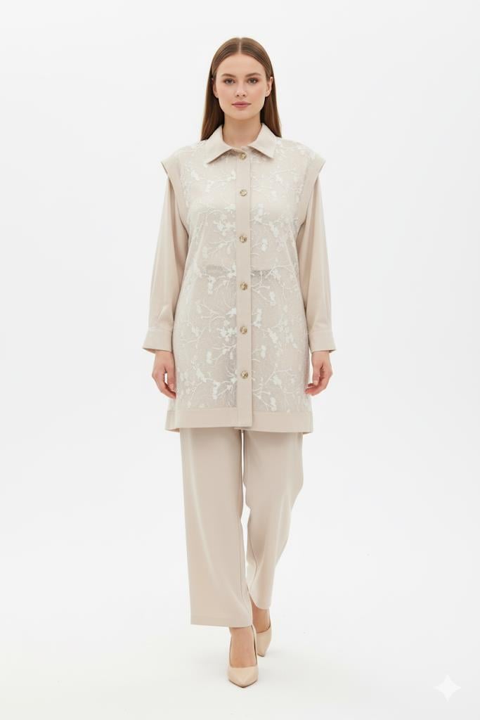 Yelekli Üçlü Pantolonlu Takım 1406 - Bej