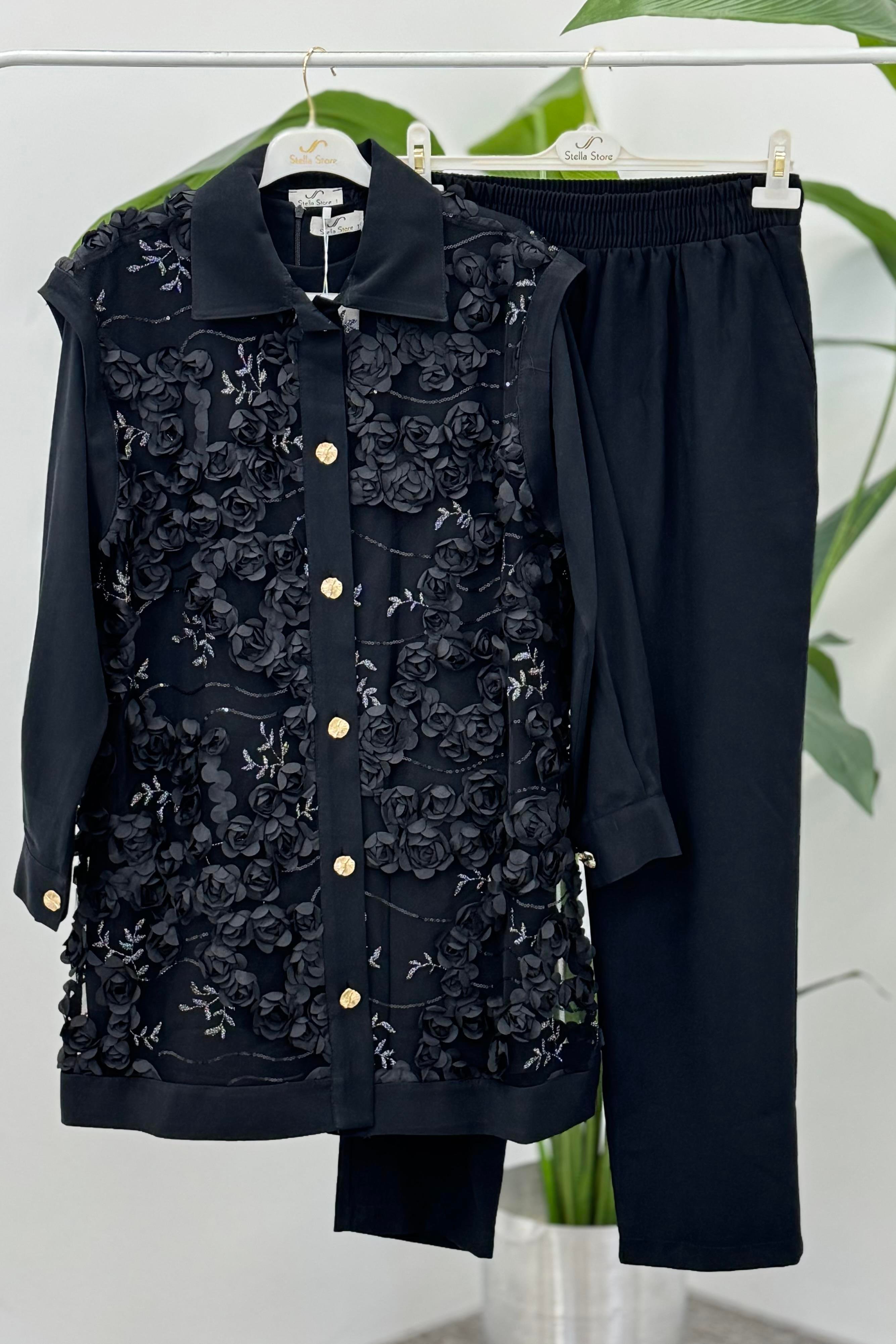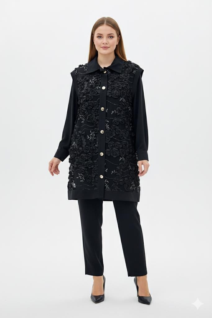 Yelekli Üçlü Pantolonlu Takım 1406 - Bej Yelekli Üçlü Pantolonlu Takım 1406 - Siyah